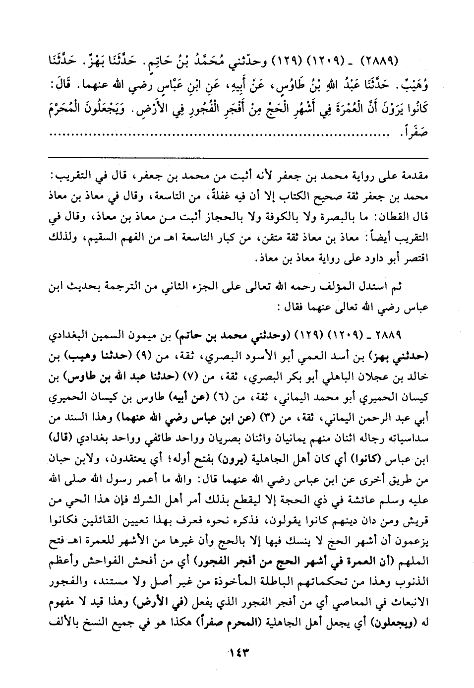 (٢٨٨٩) - (١٢٠٩) (١٢٩) وحدّثني مُحَمَّدُ بْنُ حَاتِمٍ. حَدَّثَنَا بَهْزٌ. حَدَّثَنَا وُهَيبٌ. حَدَّثَنَا عَبدُ اللهِ بْنُ طَاوُسٍ، عن أَبِيهِ، عَنِ ابْنِ عَبَّاسٍ رضي الله عنهما. قَال: كَانُوا يَرَوْنَ أَن الْعُمْرَةَ فِي أَشْهُرِ الْحَجِّ مِنْ أَفْجَرِ الْفُجُورِ فِي الأَرْضِ. ويجْعَلُونَ الْمُحرَّمَ صَفَرًا