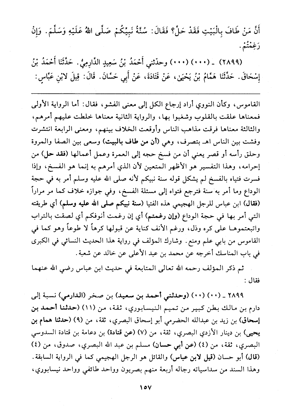٢٨٩٩ - (٠٠) (٠٠) (وحدثني أحمد بن سعيد) بن صخر (الدارمي) نسبة إلى دارم بن مالك بطن كبير من تميم النيسابوري، ثقة، من (١١) (حدثنا أحمد بن إسحاق) بن زيد بن عبد الله الحضرمي أبو إسحاق البصري، ثقة، من (٩) (حدثنا همام بن يحيى) بن دينار الأزدي البصري، ثقة، من (٧) (عن قتادة) بن دعامة بن قتادة السدوسي البصري، ثقة، من (٤) (عن أبي حسان) مسلم بن عبد الله البصري، صدوق، من (٤) (قال) أبو حسان (قيل لابن عباس) والقائل هو الرجل الهجيمي كما في الرواية السابقة. وهذا السند من سداسياته رجاله أربعة منهم بصريون وواحد طائفي وواحد نيسابوري،