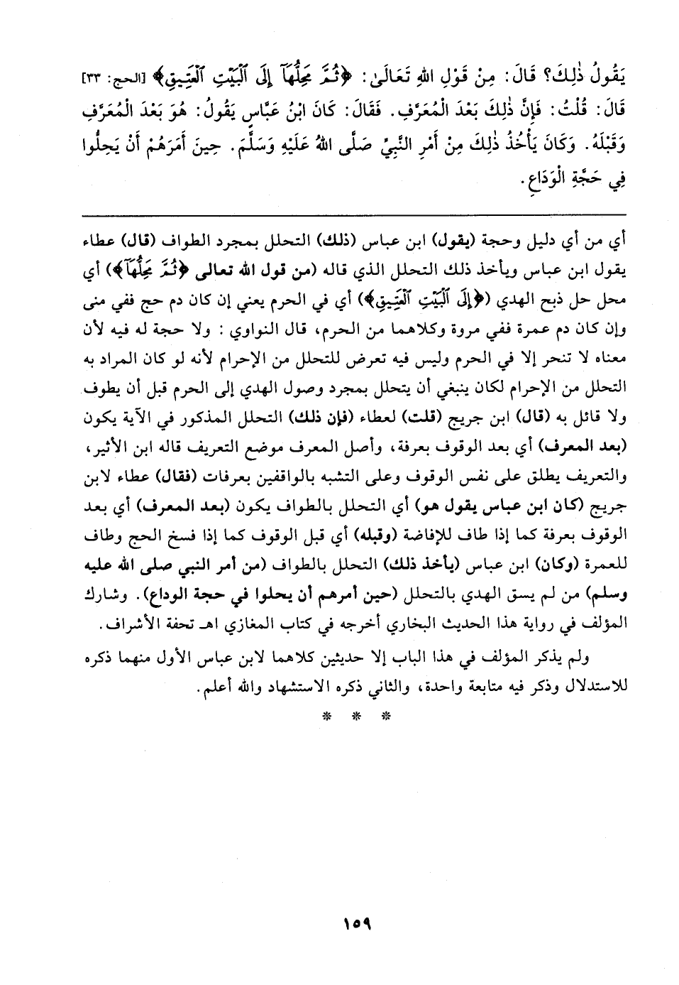 يَقُولُ ذلِكَ؟ قَال: مِنْ قَوْلِ اللهِ تَعَالى: {ثُمَّ مَحِلُّهَا إِلَى الْبَيتِ الْعَتِيقِ} [الحج: ٣٣] قَال: قُلْتُ: فَإنَّ ذلِكَ بَعْدَ الْمُعرَّفِ. فَقَال: كَانَ ابْنُ عَبَّاسٍ يَقُولُ: هُوَ بَعْدَ الْمُعَرَّفِ وَقَبْلَهُ. وَكَانَ يَأخُذُ ذلِكَ مِنْ أَمْرِ النَّبِيِّ صَلَّى اللهُ عَلَيهِ وَسَلَّمَ. حِينَ أَمَرَهُمْ أَنْ يَحِلُّوا فِي حَجَّةِ الْوَدَاعِ