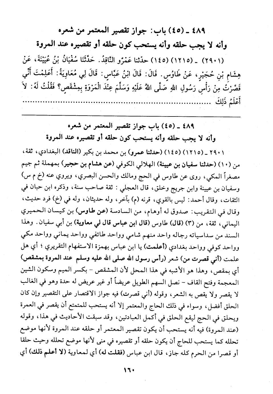 (٢٩٠١) - (١٢١٥) (١٤٥) حدَّثنا عَمْرٌو النَّاقِدُ. حَدَّثَنَا سُفْيَانُ بْنُ عُيَينَةَ، عَنْ هِشَامِ بْنِ حُجَيرٍ، عَنْ طَاوُسٍ. قَال: قَال ابْنُ عَبَّاسٍ: قَال لِي مُعَاويةُ: أَعَلِمْتَ أَنِّي قَصَّرْتُ مِنْ رَأْسِ رَسُولِ اللهِ صَلَّى اللهُ عَلَيهِ وَسلَّمَ عِنْدَ الْمَرْوَةِ بِمِشْقَصٍ؟ فَقُلْتُ لَهُ: لَا أَعْلَمُ ذَلِكَ