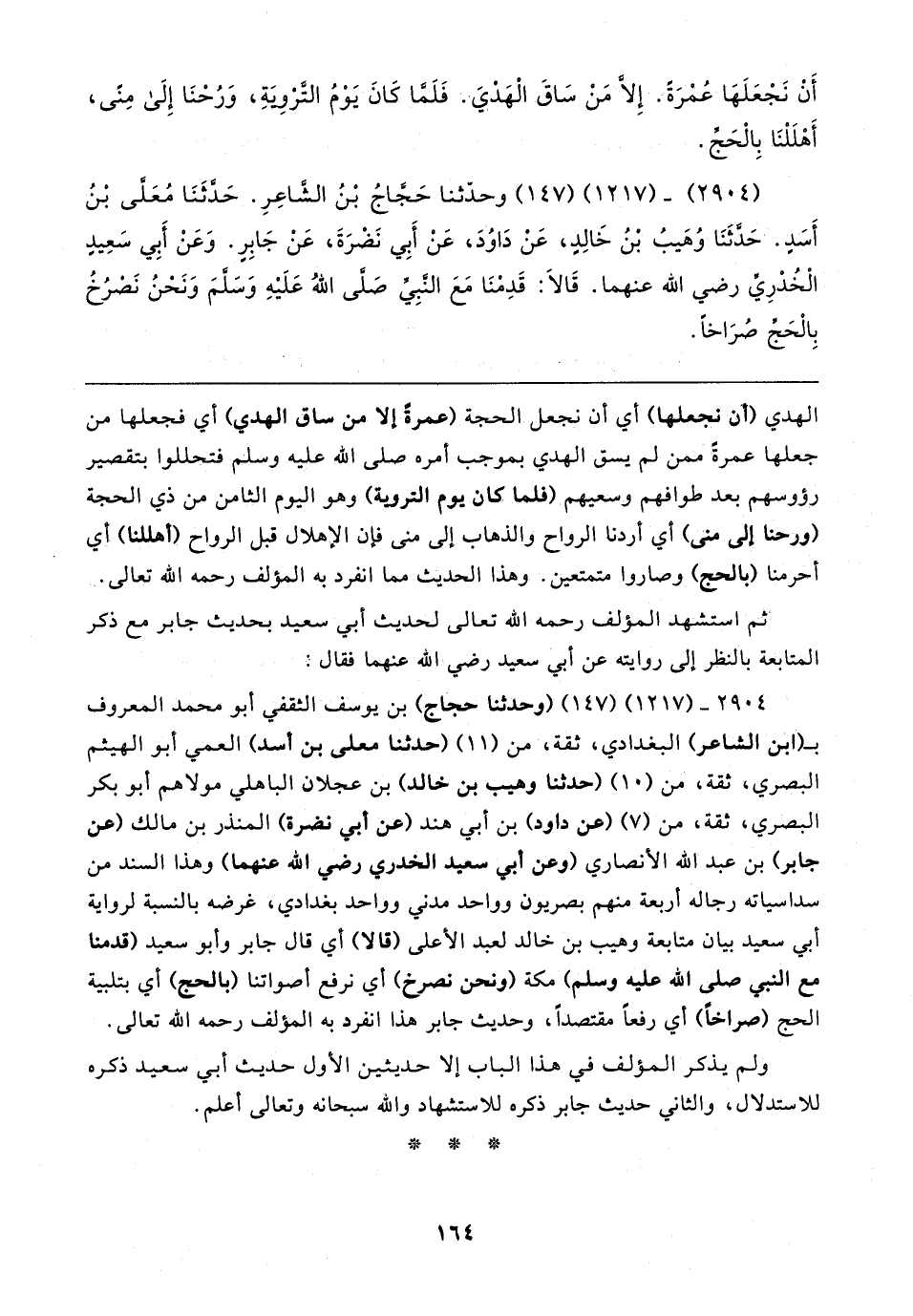 ٢٩٠٤ - (١٢١٧) (١٤٧) (وحدثنا حجاج) بن يوسف الثقفي أبو محمد المعروف بـ (ابن الشاعر) البغدادي، ثقة، من (١١) (حدثنا معلي بن أسد) العمي أبو الهيثم البصري، ثقة، من (١٠) (حدثنا وهيب بن خالد) بن عجلان الباهلي مولاهم أبو بكر البصري، ثقة، من (٧) (عن داود) بن أبي هند (عن أبي نضرة) المنذر بن مالك (عن جابر) بن عبد الله الأنصاري (وعن أبي سعيد الخدري رضي الله عنهما) وهذا السند من سداسياته رجاله أربعة منهم بصريون وواحد مدني وواحد بغدادي، غرضه بالنسبة لرواية أبي سعيد بيان متابعة وهيب بن خالد لعبد الأعلى (قالا) أي قال جابر وأبو سعيد (قدمنا مع النبي صلى الله عليه وسلم) مكة (ونحن نصرخ) أي نرفع أصواتنا (بالحج) أي بتلبية الحج (صراخًا) أي رفعًا مقتصدًا، وحديث جابر هذا انفرد به المؤلف رحمه الله تعالى.