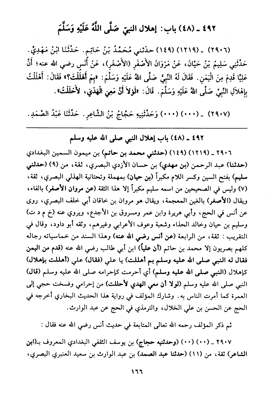 ٢٩٠٦ - (١٢١٩) (١٤٩) (حدثني محمد بن حاتم) بن ميمون السمين البغدادي (حدثنا) عبد الرحمن (بن مهدي) بن حسان الأزدي البصري، ثقة، من (٩) (حدثني سليم) بفتح السين وكسر اللام مكبرًا (بن حيان) بمهملة وتحتانية الهذلي البصري، ثقة، (٧) وليس في الصحيحين من اسمه سليم مكبرًا إلا هذا الثقة (عن مروان الأصفر) بالفاء، ويقال (الأصغر) بالغين المعجمة، ويقال هو مروان بن خاقان أبي خلف البصري، روى عن أنس في الحج، وأبي هريرة وابن عمر ومسروق بن الأجدع، ويروي عنه (خ م د ت) وسليم بن حيان وخالد الحذاء وشعبة وعوف الأعرابي وغيرهم، وثقه أبو داود، وقال في التقريب: ثقة، من الرابعة (عن أنس رضي الله عنه) وهذا السند من خماسياته رجاله كلهم بصريون إلا محمد بن حاتم (أن عليًّا) ابن أبي طالب رضي الله عنه (قدم من اليمن فقال له النبي صلى الله عليه وسلم بم أهللت) يا علي (فقال) علي (أهللت بإهلال) كإهلال (النبي صلى الله عليه وسلم) أي أحرمت كإحرامه صلى الله عليه وسلم (قال) النبي صلى الله عليه وسلم (لولا أن معي الهدي لأحللت) من إحرامي وفسخت حجي إلى العمرة كما أمرت الناس به. وشارك المؤلف في رواية هذا الحديث البخاري أخرجه في الحج عن الحسن بن علي الخلال، والترمذي في الحج عن عبد الوارث.