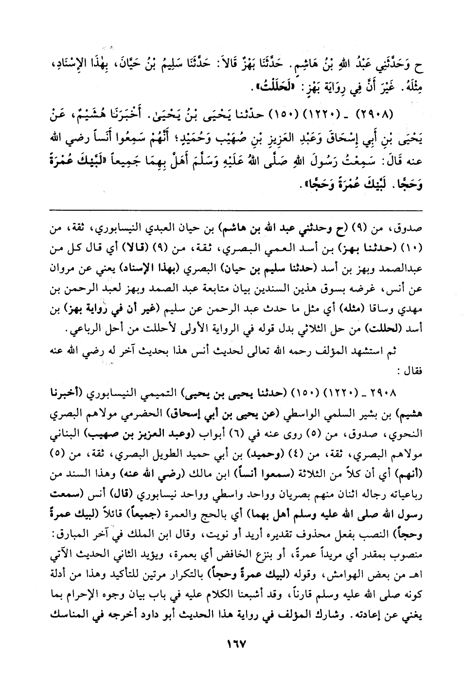 (٢٩٠٨) - (١٢٢٠) (١٥٠) حدَّثنا يَحْيَى بْنُ يَحْيَى. أَخْبَرَنا هُشَيمٌ، عَنْ يَحْيَى بْنِ أَبِي إِسْحَاقَ وَعَنْدِ العَزِيزِ بْنِ صُهَيب وَحُمَيدٍ؛ أَنَّهُمْ سَمِعُوا أَنَسًا رضي الله عنه قَال: سَمِعْتُ رَسُولَ اللهِ صَلَّى اللهُ عَلَيهِ وَسَلَّمَ أهَلَّ بِهِمَا جَمِيعًا "لَبَّيكَ عُمْرَةً وَحَجًّا. لَبَّيكَ عُمْرَةً وَحَجًّا"