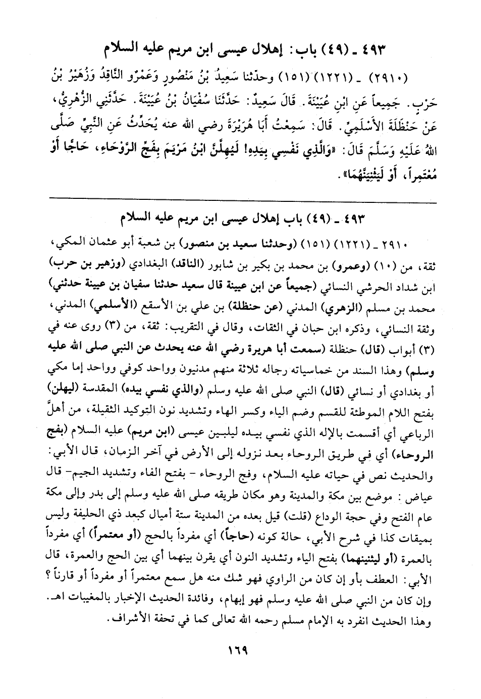 (٢٩١٠) - (١٢٢١) و (١٥١) وحدّثنا سَعِيدُ بْنُ مَنْصُورٍ وَعَمْرٌو النَّاقِدُ وَزُهَيرُ بْنُ حَرْبٍ. جَمِيعًا عَنِ ابْنِ عُيَينَةَ. قَال سَعِيدٌ: حَدَّثَنَا سُفْيَانُ بْنُ عُيَينَةَ. حَدَّثَنِي الزُّهْريُّ، عَنْ حَنْظَلَةَ الأَسْلَمِيِّ. قَال: سَمِعْتُ أَبَا هُرَيرَةَ رضي الله عنه يُحَدِّثُ عَنِ النَّبِيِّ صَلَّى اللهُ عَلَيهِ وَسَلَّمَ قَال: "وَالَّذِي نَفْسِي بِيَدِهِ! لَيُهِلَّنَّ ابْنُ مَرْيَمَ بِفَجِّ الرَّوْحَاءِ، حَاجًّا أَوْ مُعْتَمِرًا، أَوْ لَيَثْنِيَنَّهُمَا"