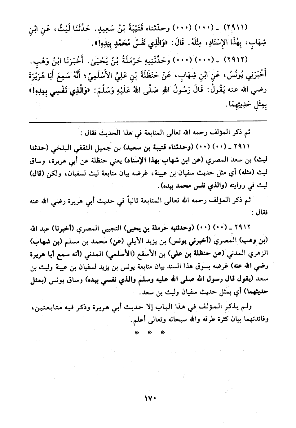 ٢٩١١ - (٠٠) (٠٠) (وحدثناه قتيبة بن سعيد) بن جميل الثقفي البلخي (حدثنا ليث) بن سعد المصري (عن ابن شهاب بهذا الإسناد) يعني حنظلة عن أبي هريرة، وساق ليث (مثله) أي مثل حديث سفيان بن عيينة، غرضه بيان متابعة ليث لسفيان، ولكن (قال) ليث في روايته (والذي نفس محمد بيده).