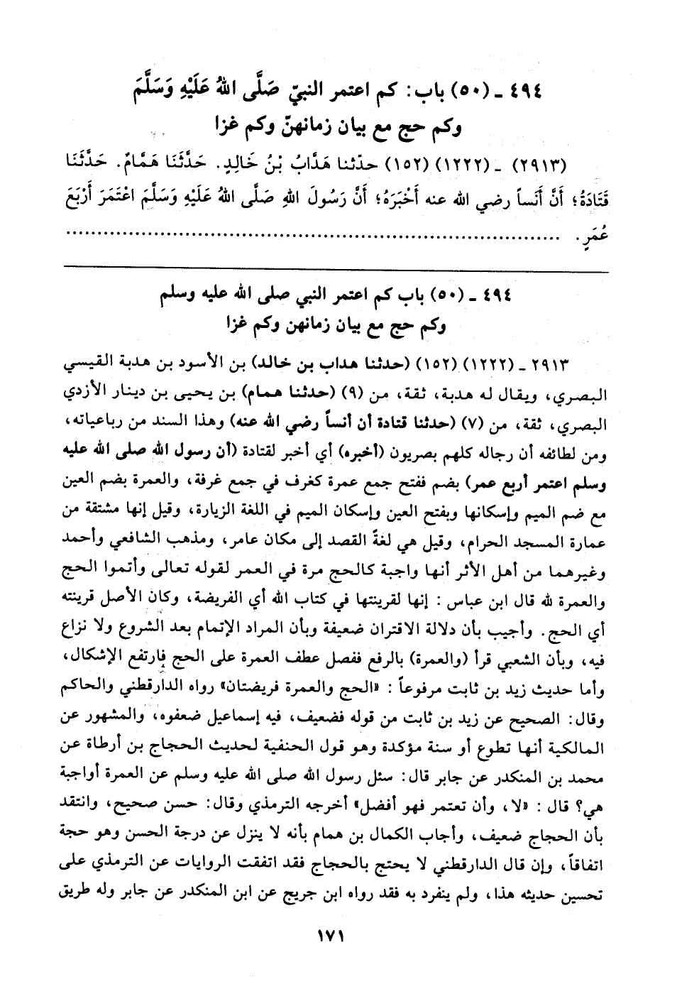 (٢٩١٣) - (١٢٢٢) (١٥٢) حدَّثنا هَدَّابُ بن خَالِدٍ. حَدَّثَنَا هَمَّامٌ. حَدَّثَنَا قَتَادَةُ؛ أَنَّ أَنَسًا رضي الله عنه أَخبَرَهُ؛ أَنَّ رَسُولَ اللهِ صَلَّى اللهُ عَلَيهِ وَسَلَّمَ اعْتَمَرَ أَرْبَعَ عُمَرٍ