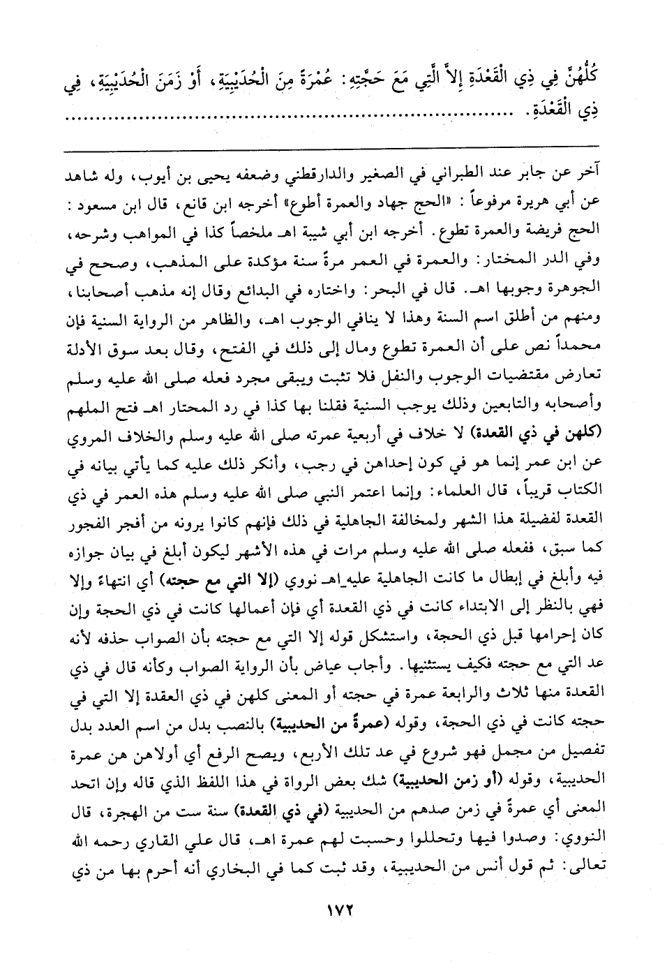 آخر عن جابر عند الطبراني في الصغير والدارقطني وضعفه يحيى بن أيوب، وله شاهد عن أبي هريرة مرفوعًا: "الحج جهاد والعمرة أطوع" أخرجه ابن قانع، قال ابن مسعود: الحج فريضة والعمرة تطوع. أخرجه ابن أبي شيبة اهـ ملخصًا كذا في المواهب وشرحه، وفي الدر المختار: والعمرة في العمر مرة سنة مؤكدة على المذهب، وصحح في الجوهرة وجوبها اهـ. قال في البحر: واختاره في البدائع وقال إنه مذهب أصحابنا، ومنهم من أطلق اسم السنة وهذا لا ينافي الوجوب اهـ، والظاهر من الرواية السنية فإن محمدًا نص على أن العمرة تطوع ومال إلى ذلك في الفتح، وقال بعد سوق الأدلة تعارض مقتضيات الوجوب والنفل فلا تثبت ويبقى مجرد فعله صلى الله عليه وسلم وأصحابه والتابعين وذلك يوجب السنية فقلنا بها كذا في رد المحتار اهـ فتح الملهم (كلهن في ذي القعدة) لا خلاف في أربعية عمرته صلى الله عليه وسلم والخلاف المروي عن ابن عمر إنما هو في كون إحداهن في رجب، وأنكر ذلك عليه كما يأتي بيانه في الكتاب قريبًا، قال العلماء: وإنما اعتمر النبي صلى الله عليه وسلم هذه العمر في ذي القعدة لفضيلة هذا الشهر ولمخالفة الجاهلية في ذلك فإنهم كانوا يرونه من أفجر الفجور كما سبق، ففعله صلى الله عليه وسلم مرات في هذه الأشهر ليكون أبلغ في بيان جوازه فيه وأبلغ في إبطال ما كانت الجاهلية عليه- اهـ نووي (إلا التي مع حجته) أي انتهاءً وإلا فهي بالنظر إلى الابتداء كانت في ذي القعدة أي فإن أعمالها كانت في ذي الحجة وإن كان إحرامها قبل ذي الحجة، واستشكل قوله إلا التي مع حجته بأن الصواب حذفه لأنه عد التي مع حجته فكيف يستثنيها. وأجاب عياض بأن الرواية الصواب وكأنه قال في ذي القعدة منها ثلاث والرابعة عمرة في حجته أو المعنى كلهن في ذي العقدة إلا التي في حجته كانت في ذي الحجة، وقوله (عمرةً من الحدببية) بالنصب بدل من اسم العدد بدل تفصيل من مجمل فهو شروع في عد تلك الأربع، ويصح الرفع أي أولاهن هن عمرة الحديبية، وقوله (أو زمن الحديبية) شك بعض الرواة في هذا اللفظ الذي قاله وإن اتحد المعنى أي عمرة في زمن صدهم من الحديبية (في ذي القعدة) سنة ست من الهجرة، قال النووي: وصدوا فيها وتحللوا وحسبت لهم عمرة اهـ، قال علي القاري رحمه الله تعالى: ثم قول أنس من الحديبية، وقد ثبت كما في البخاري أنه أحرم بها من ذي