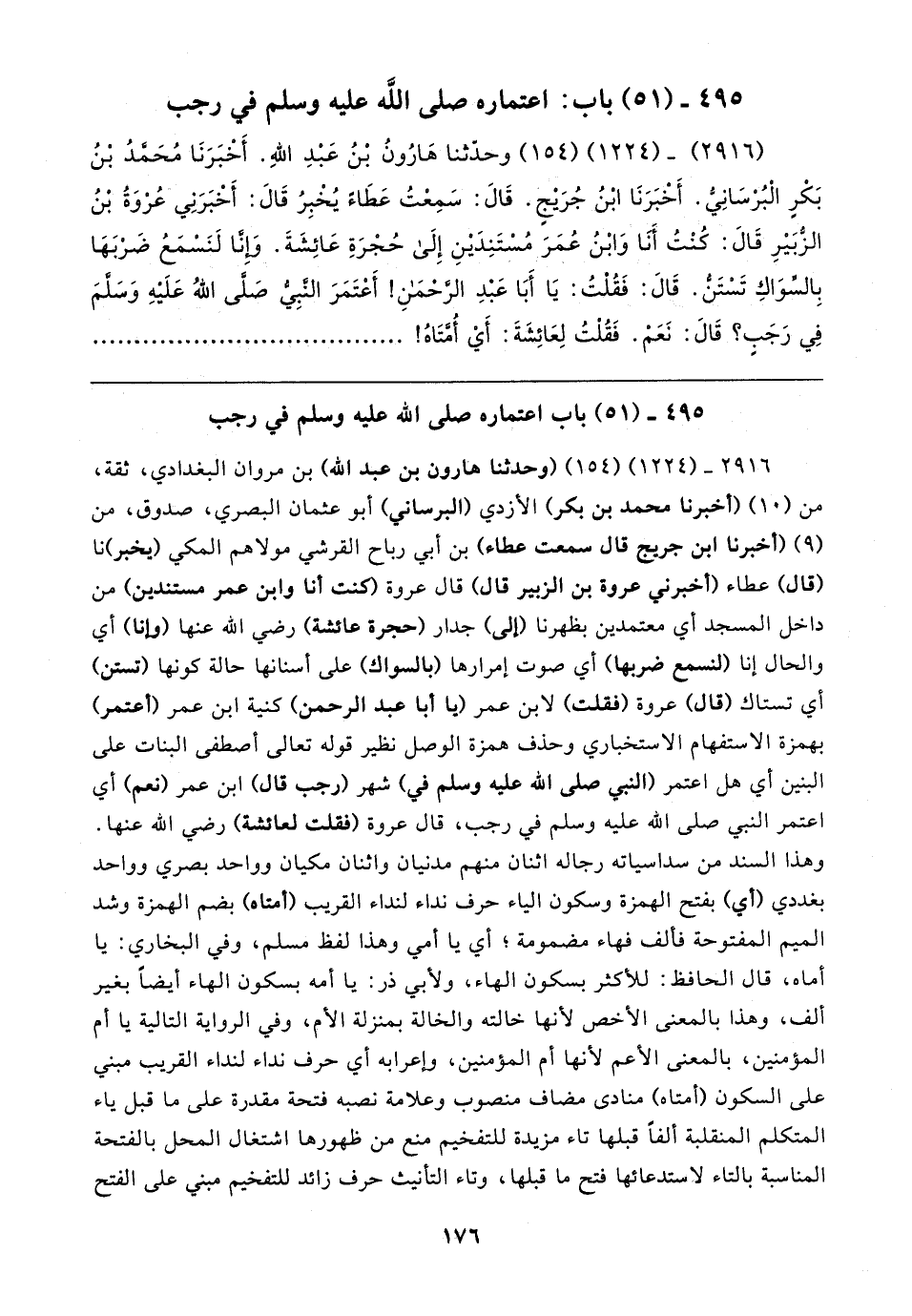 ٢٩١٦ - (١٢٢٤) (١٥٤) (وحدثنا هارون بن عبد الله) بن مروان البغدادي، ثقة، من (١٠) (أخبرنا محمد بن بكر) الأزدي (البرساني) أبو عثمان البصري، صدوق، من (٩) (أخبرنا ابن جريج قال سمعت عطاء) بن أبي رباح القرشي مولاهم المكي (يخبر) نا (قال) عطاء (أخبرني عروة بن الزبير قال) قال عروة (كنت أنا وابن عمر مستندين) من داخل المسجد أي معتمدين بظهرنا (إلى) جدار (حجرة عائشة) رضي الله عنها (وإنا) أي والحال إنا (لنسمع ضربها) أي صوت إمرارها (بالسواك) على أسنانها حالة كونها (تستن) أي تستاك (قال) عروة (فقلت) لابن عمر (يا أبا عبد الرحمن) كنية ابن عمر (أعتمر) بهمزة الاستفهام الاستخباري وحذف همزة الوصل نظير قوله تعالى أصطفى البنات على البنين أي هل اعتمر (النبي صلى الله عليه وسلم في) شهر (رجب قال) ابن عمر (نعم) أي اعتمر النبي صلى الله عليه وسلم في رجب، قال عروة (فقلت لعائشة) رضي الله عنها. وهذا السند من سداسياته رجاله اثنان منهم مدنيان واثنان مكيان وواحد بصري وواحد بغددي (أي) بفتح الهمزة وسكون الياء حرف نداء لنداء القريب (أمتاه) بضم الهمزة وشد الميم المفتوحة فألف فهاء مضمومة؛ أي يا أمي وهذا لفظ مسلم، وفي البخاري: يا أماه، قال الحافظ: للأكثر بسكون الهاء، ولأبي ذر: يا أمه بسكون الهاء أيضًا بغير ألف، وهذا بالمعنى الأخص لأنها خالته والخالة بمنزلة الأم، وفي الرواية التالية يا أم المؤمنين، بالمعنى الأعم لأنها أم المؤمنين، وإعرابه أي حرف نداء لنداء القريب مبني على السكون (أمتاه) منادى مضاف منصوب وعلامة نصبه فتحة مقدرة على ما قبل ياء المتكلم المنقلبة ألفًا قبلها تاء مزيدة للتفخيم منع من ظهورها اشتغال المحل بالفتحة المناسبة بالتاء لاستدعائها فتح ما قبلها، وتاء التأنيث حرف زائد للتفخيم مبني على الفتح