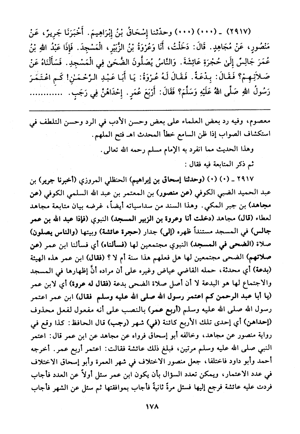 (٢٩١٧) - (٠٠) (٠٠) وَحَدَّثَنَا إِسْحَاقُ بْنُ إِبْرَاهِيمَ. أَخْبَرَنَا جَرِيرٌ، عَنْ مَنْصُورٍ، عَنْ مُجَاهِدٍ. قَال: دَخَلْتُ, أَنَا وَعُرْوَةُ بْنُ الزُّبَيرِ, الْمَسْجِدَ. فَإِذَا عَبْدُ اللَّهِ بْنُ عُمَرَ جَالِسٌ إِلَى حُجْرَةِ عَائِشَةَ. وَالنَّاسُ يُصَلُّونَ الضُّحَى فِي الْمَسْجِدِ. فَسَأَلْنَاهُ عَنْ صَلاتِهِمْ؟ فَقَال: بِدْعَةٌ. فَقَال لَهُ عُرْوَةُ: يَا أَبَا عَبْدِ الرَّحْمَنِ! كَمِ اعْتَمَرَ رَسُولُ اللهِ صلى الله عليه وسلم؟ فَقَال: أَرْبَعَ عُمَرٍ. إِحْدَاهُنَّ فِي رَجَبٍ