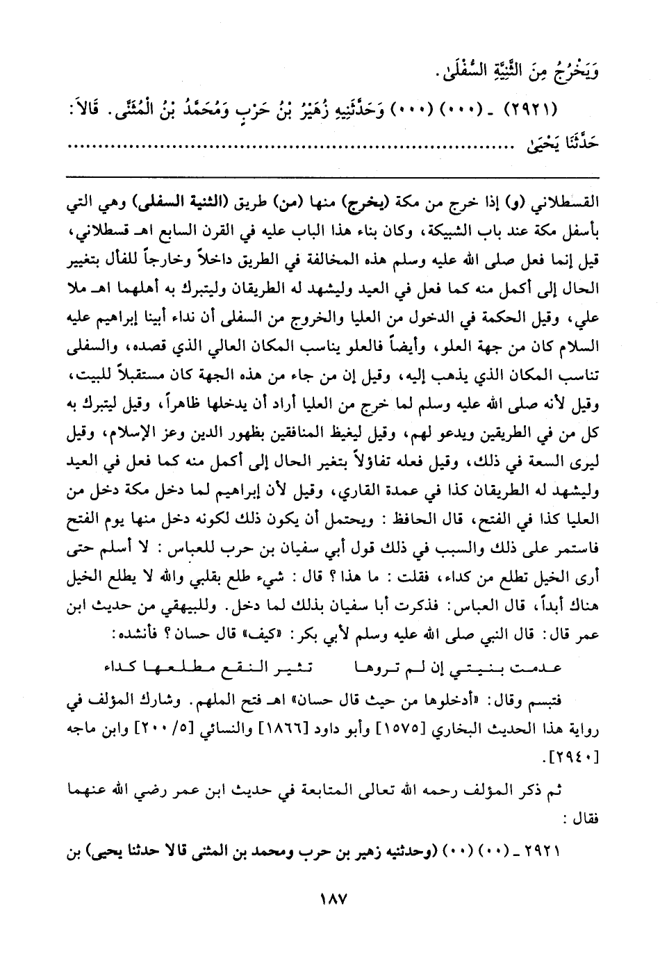 فتبسم وقال: "أدخلوها من حيث قال حسان" اهـ فتح الملهم. وشارك المؤلف في رواية هذا الحديث البخاري [١٥٧٥] وأبو داود [١٨٦٦] والنسائي [٥/ ٢٠٠] وابن ماجه [٢٩٤٠].