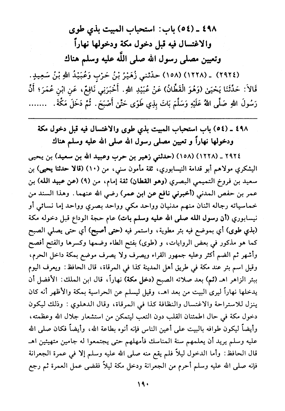 ٤٩٨ - (٥٤) باب: استحباب المبيت بذي طوى والاغتسال فيه قبل دخول مكة ودخولها نهارًا وتعيين مصلى رسول الله صلى الله عليه وسلم هناك