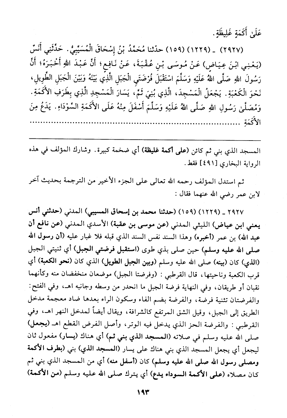 (٢٩٢٧) - (١٢٢٩) (١٥٩) حَدَّثَنَا مُحَمَّدُ بْنُ إِسْحَاقَ الْمُسَيَّبِيُّ. حَدَّثَنِي أَنَسٌ (يَعْنِي ابْنَ عِيَاضٍ) عَنْ مُوسَى بْنِ عُقْبَةَ, عَنْ نَافِعٍ؛ أَنَّ عَبْدَ اللَّهِ أَخْبَرَهُ؛ أَنَّ رَسُولَ اللهِ صلى الله عليه وسلم اسْتَقْبَلَ فُرْضَتَي الْجَبَلِ الَّذِي بَينَهُ وَبَينَ الْجَبَلِ الطَّويلِ, نَحْوَ الْكَعْبَةِ. يَجْعَلُ الْمَسْجِدَ, الَّذِي بُنِيَ ثَمَّ, يَسَارَ الْمَسْجِدِ الَّذِي بِطَرَفِ الأَكَمَةِ. وَمُصَلَّى رَسُولِ اللَّهِ صلى الله عليه وسلم أَسْفَلَ مِنْهُ عَلَى الأَكَمَةِ السَّوْدَاءِ. يَدَعُ مِنَ الأَكَمَةِ