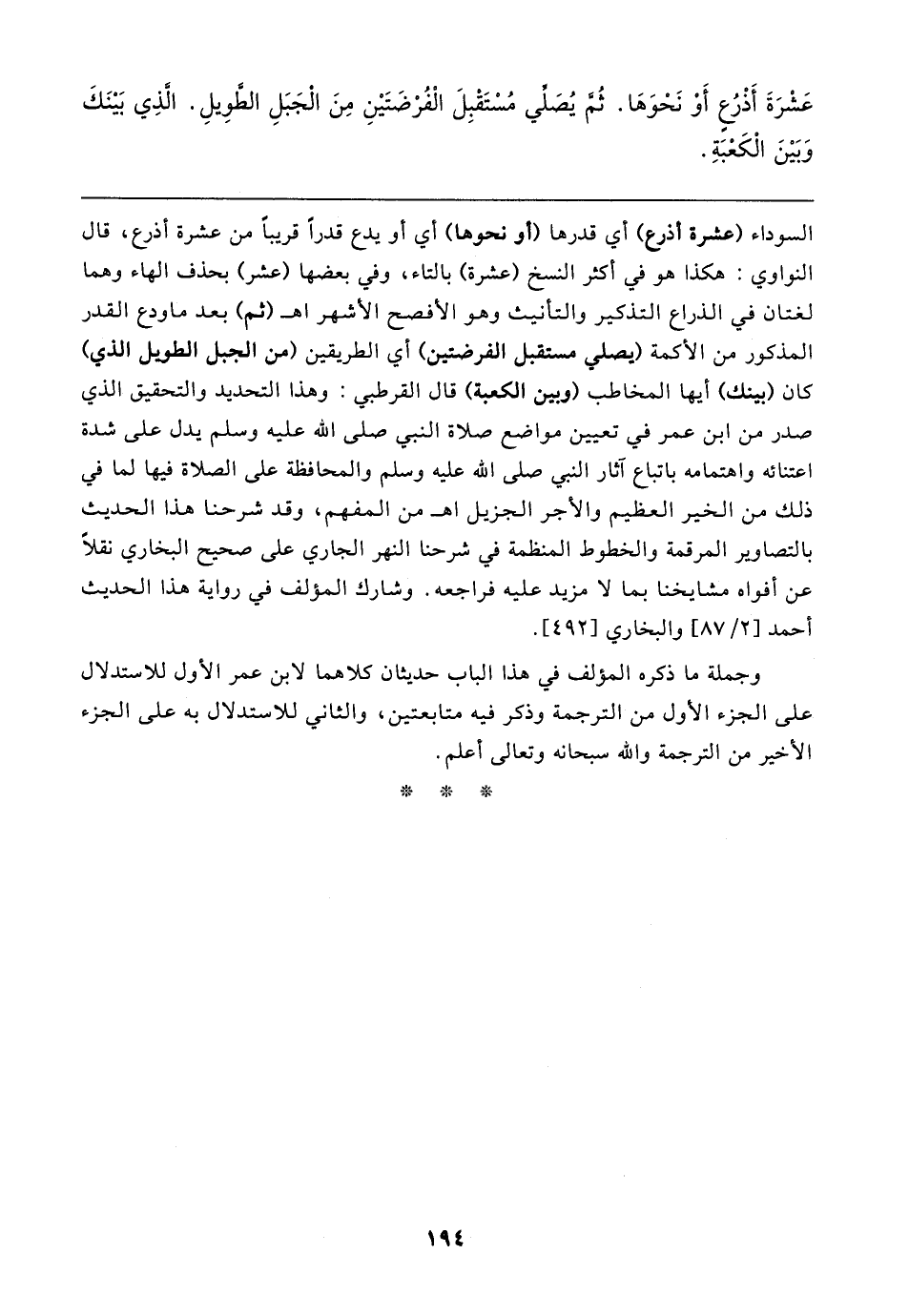 السوداء (عشرة أذرع) أي قدرها (أو نحوها) أي أو يدع قدرًا قريبًا من عشرة أذرع، قال النواوي: هكذا هو في أكثر النسخ (عشرة) بالتاء، وفي بعضها (عشر) بحذف الهاء وهما لغتان في الذراع التذكير والتأنيث وهو الأفصح الأشهر اهـ (ثم) بعد ما ودع القدر المذكور من الأكمة (يصلي مستقبل الفرضتين) أي الطريقين (من الجبل الطويل الذي) كان (بينك) أيها المخاطب (وبين الكعبة) قال القرطبي: وهذا التحديد والتحقيق الذي صدر من ابن عمر في تعيين مواضع صلاة النبي صلى الله عليه وسلم يدل على شدة اعتنائه واهتمامه باتباع آثار النبي صلى الله عليه وسلم والمحافظة على الصلاة فيها لما في ذلك من الخير العظيم والأجر الجزيل اهـ من المفهم، وقد شرحنا هذا الحديث بالتصاوير المرقمة والخطوط المنظمة في شرحنا النهر الجاري على صحيح البخاري نقلًا عن أفواه مشايخنا بما لا مزيد عليه فراجعه. وشارك المؤلف في رواية هذا الحديث أحمد [٢/ ٨٧] والبخاري [٤٩٢].
