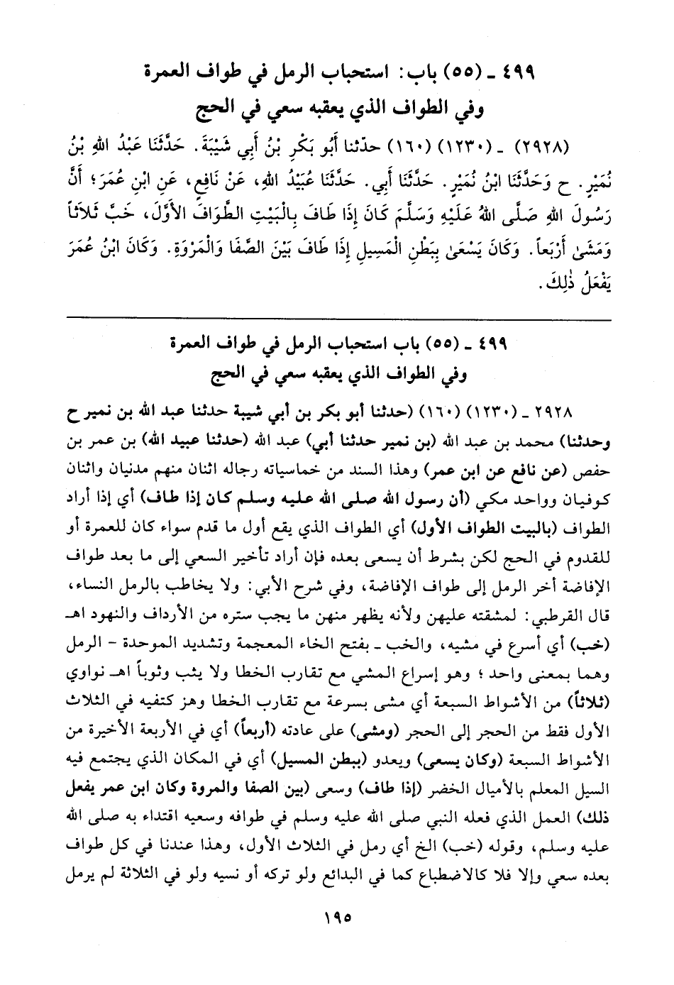 (٢٩٢٨) - (١٢٣٠) (١٦٠) حَدَّثَنَا أَبُو بَكْرِ بْنُ أَبِي شَيبَةَ. حَدَّثَنَا عَبْدُ اللَّهِ بْنُ نُمَيرٍ. ح وَحَدَّثَنَا ابْنُ نُمَيرٍ. حَدَّثَنَا أَبِي. حَدَّثَنَا عُبَيدُ اللَّهِ، عَنْ نَافِعٍ، عَنِ ابْنِ عُمَرَ؛ أَنَّ رَسُولَ اللهِ صلى الله عليه وسلم كَانَ إِذَا طَافَ بِالْبَيتِ الطَّوَافَ الأَوَّلَ, خَبَّ ثَلاثًا وَمَشَى أَرْبَعًا. وَكَانَ يَسْعَى بِبَطْنِ الْمَسِيلِ إِذَا طَافَ بَينَ الصَّفَا وَالْمَرْوَةِ. وَكَانَ ابْنُ عُمَرَ يَفْعَلُ ذَلِكَ