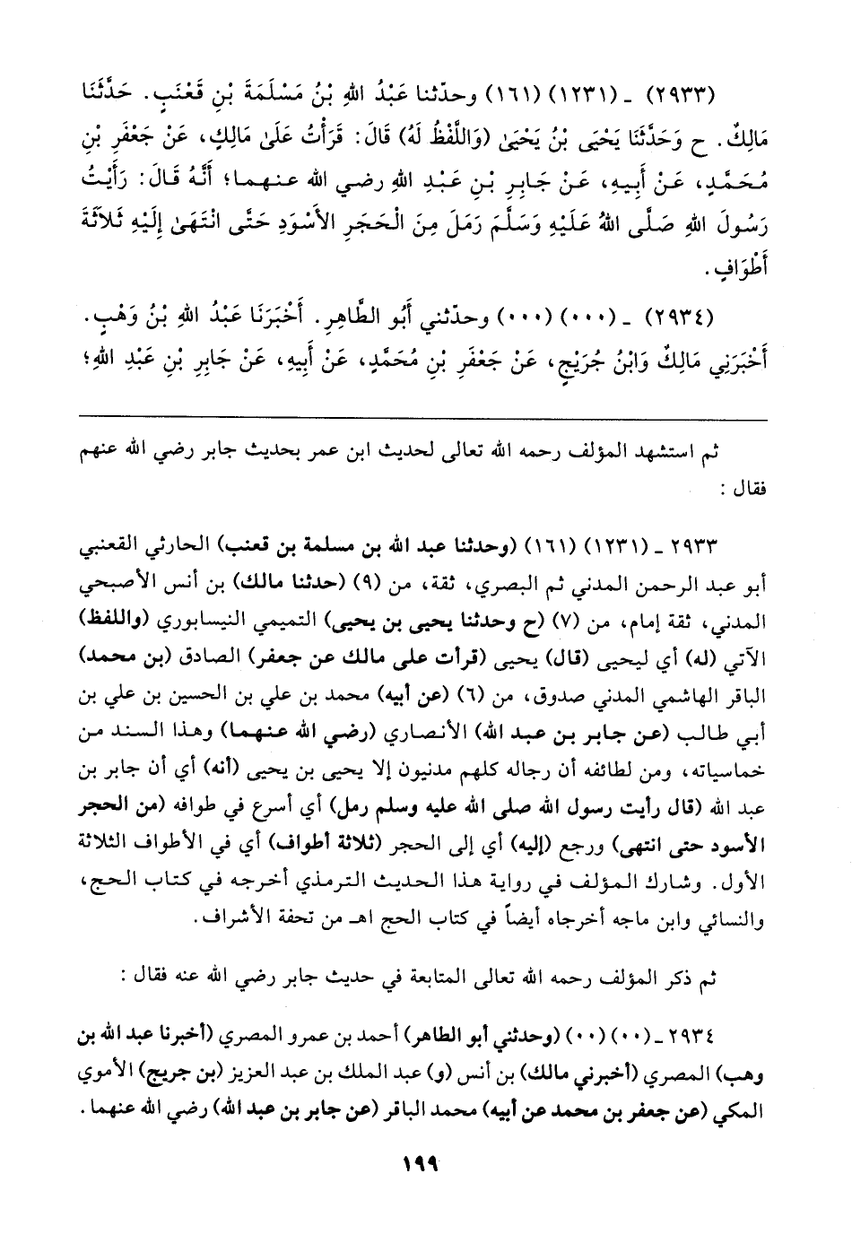 ٢٩٣٣ - (١٢٣١) (١٦١) (وحدثنا عبد الله بن مسلمة بن قعنب) الحارثي القعنبي أبو عبد الرحمن المدني ثم البصري، ثقة، من (٩) (حدثنا مالك) بن أنس الأصبحي المدني، ثقة إمام، من (٧) (ح وحدثنا يحيى بن يحيى) التميمي النيسابوري (واللفظ) الآتي (له) أي ليحيى (قال) يحيى (قرأت على مالك عن جعفر) الصادق (بن محمد) الباقر الهاشمي المدني صدوق، من (٦) (عن أبيه) محمد بن علي بن الحسين بن علي بن أبي طالب (عن جابر بن عبد الله) الأنصاري (رضي الله عنهما) وهذا السند من خماسياته، ومن لطائفه أن رجاله كلهم مدنيون إلا يحيى بن يحيى (أنه) أي أن جابر بن عبد الله (قال رأيت رسول الله صلى الله عليه وسلم رمل) أي أسرع في طوافه (من الحجر الأسود حتى انتهى) ورجع (إليه) أي إلى الحجر (ثلاثة أطواف) أي في الأطواف الثلاثة الأول. وشارك المؤلف في رواية هذا الحديث الترمذي أخرجه في كتاب الحج، والنسائي وابن ماجه أخرجاه أيضًا في كتاب الحج اهـ من تحفة الأشراف.