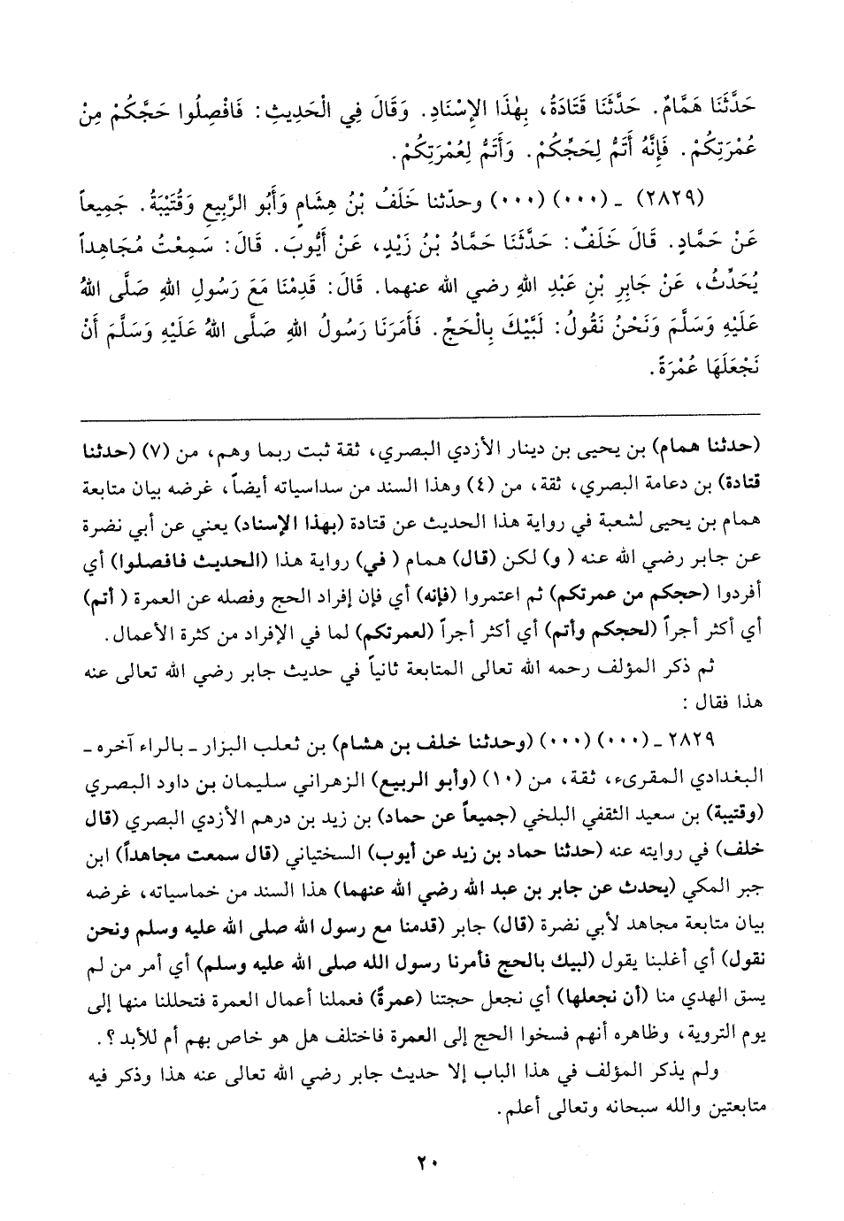 ٢٨٢٩ - (٠٠) (٠٠) (وحدثنا خلف بن هشام) بن ثعلب البزار -بالراء آخره- البغدادي المقرئ، ثقة، من (١٠) (وأبو الربيع) الزهراني سليمان بن داود البصري (وقتيبة) بن سعيد الثقفي البلخي (جميعًا عن حماد) بن زيد بن درهم الأزدي البصري (قال خلف) في روايته عنه (حدثنا حماد بن زيد عن أيوب) السختياني (قال سمعت مجاهدًا) ابن جبر المكي (يحدث عن جابر بن عبد الله رضي الله عنهما) هذا السند من خماسياته، غرضه بيان متابعة مجاهد لأبي نضرة (قال) جابر (قدمنا مع رسول الله صلى الله عليه وسلم ونحن نقول) أي أغلبنا يقول (لبيك بالحج فأمرنا رسول الله صلى الله عليه وسلم) أي أمر من لم يسق الهدي منا (أن نجعلها) أي نجعل حجتنا (عمرةً) فعملنا أعمال العمرة فتحللنا منها إلى يوم التروية، وظاهره أنهم فسخوا الحج إلى العمرة فاختلف هل هو خاص بهم أم للأبد؟ .
