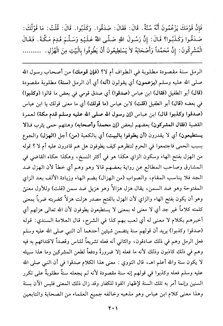الرمل سنة مقصودة مطلوبة في الطواف أم لا؟ (فإن قومك) من أصحاب رسول الله صلى الله عليه وسلم (يزعمون) أي يقولون (أنه) أي أن الرمل (سنة) مطلوبة مقصودة (قال) أبو الطفيل (فقال) ابن عباس (صدقوا) أي صدق قومي في بعض ما قالوا (وكذبوا) في بعضه (قال) أبو الطفيل (قلت) لابن عباس (ما قولك) أي ما معنى قولك يا ابن عباس (صدقوا وكذبوا قال) ابن عباس (إن رسول الله صلى الله عليه وسلم قدم مكة) لعمرة القضية (فقال المشركون) بعضهم لبعض (إن محمدًا وأصحابه) وهنتهم حمى يثرب فـ (لا يستطيعون) أي لا يقدرون (أن يطوفوا بالبيت) أي بالكعبة (من) أجل (الهزل) والجوع بسبب الحمى فاجتمعوا في الحرم لننظرهم كيف يطوفون هل هم قادرون عليه أم لا؟ قوله من الهزل بفتح الهاء وسكون الزاي هكذا هو في أكثر النسخ، وهكذا حكاه القاضي في المشارق وصاحب المطالع عن رواية بعضهم قالا وهو وهم أي خطأ لأن الهزل ضد الجد فلا يناسب المقام، والصواب (من الهزال) بضم الهاء وزيادة الألف بعد الزاي المفتوحة وهو ضد السمن، يقال هزل هزالًا وهو هزيل ضد سمن (قلت) وللأول معنىً وهو أن يكون بفتح الهاء والزاي لأن الهزل بالفتح مصدر هزلت هزلًا كضربته ضربًا بمعنى كلمته كلامًا غير جد أي لا معنى له بمعنى لا يستطيعون يطوفون لأن الله تعالى هزلهم أي أخبرهم بكلام لا معنى له أي لعب بهم كذا في الشرح، قال العلامة السندي: قوله (صدقوا وكذبوا) يريد أن قولهم سنة يتضمن شيئين أحدهما أن النبي صلى الله عليه وسلم فعل الرمل وهم في ذلك صادقون، والثاني أنه فعله تشريعًا للناس وقصدًا لاقتدائهم به فيه وهم في ذلك كاذبون وذلك لأنه ما فعله إلا ضرورةً ودفعًا لطعن المشركين وما هذا سبيله لا يكون سنة والله أعلم اهـ، قال النووي: معنى هذا الكلام صدقوا في أن النبي صلى الله عليه وسلم فعله وكذبوا في قولهم إنه سنة مقصودة لأنه لم يجعله سنةً مطلوبةً على تكرر السنين وإنما أمر به تلك السنة لإظهار القوة للكفار وقد زال ذلك المعنى فليس الآن بسنة وهذا معنى كلام ابن عباس وهو مذهبه وخالفه جميع العلماء من الصحابة والتابعين