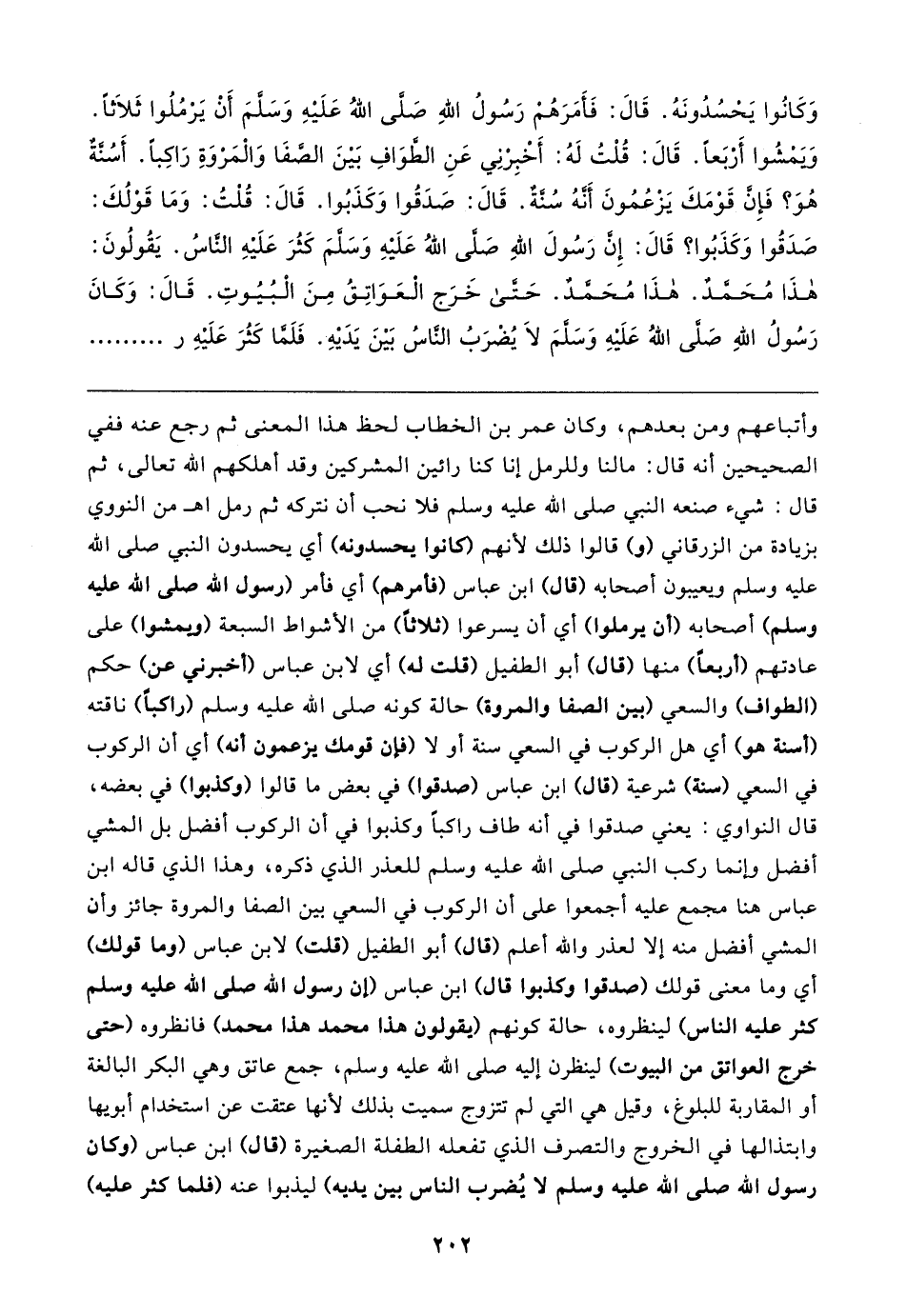 وَكَانُوا يَحْسُدُونَهُ. قَال: فَأَمَرَهُمْ رَسُولُ اللهِ صلى الله عليه وسلم أَنْ يَرْمُلُوا ثَلاثًا. وَيَمْشُوا أَرْبَعًا. قَال: قُلْتُ لَهُ: أَخْبِرْنِي عَنِ الطَّوَافِ بَينَ الصَّفَا وَالْمَرْوَةِ رَاكِبًا. أَسُنَّةٌ هُوَ؟ فَإِنَّ قَوْمَكَ يَزْعُمُونَ أَنَّهُ سُنَّةٌ. قَال: صَدَقُوا وَكَذَبُوا. قَال: قُلْتُ: وَمَا قَوْلُكَ: صَدَقُوا وَكَذَبُوا؟ قَال: إِنَّ رَسُولَ اللهِ صلى الله عليه وسلم كَثُرَ عَلَيهِ النَّاسُ. يَقُولُونَ: هَذَا مُحَمَّدٌ. هَذَا مُحَمَّدٌ. حَتَّى خَرَجَ الْعَوَاتِقُ مِنَ الْبُيُوتِ. قَال: وَكَانَ رَسُولُ اللهِ صلى الله عليه وسلم لَا يُضْرَبُ النَّاسُ بَينَ يَدَيهِ. فَلَمَّا كَثُرَ عَلَيهِ رَ