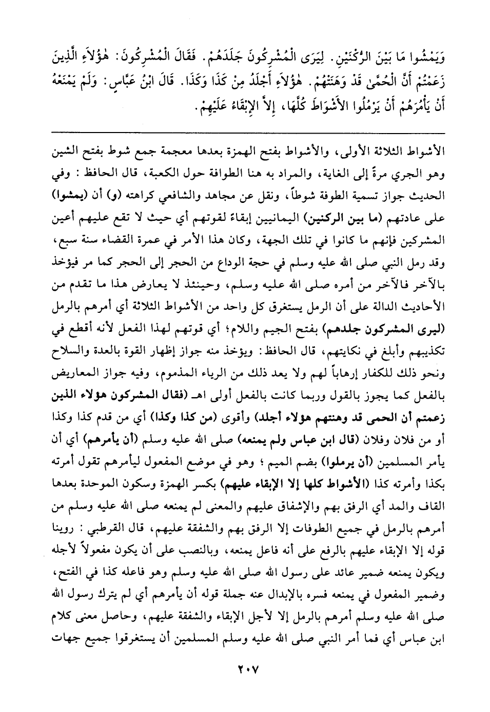 وَيَمْشُوا مَا بَينَ الرُّكْنَينِ. لِيَرَى الْمُشْرِكُونَ جَلَدَهُمْ. فَقَال الْمُشْرِكُونَ: هَؤُلاءِ الَّذِينَ زَعَمْتُمْ أَنَّ الْحُمَّى قَدْ وَهَنَتْهُمْ. هَؤُلاءِ أَجْلَدُ مِنْ كَذَا وَكَذَا. قَال ابْنُ عَبَّاسٍ: وَلَمْ يَمْنَعْهُ أَنْ يَأْمُرَهُمْ أَنْ يَرْمُلُوا الأَشْوَاطَ كُلَّهَا, إِلَّا الإِبْقَاءُ عَلَيهِمْ
