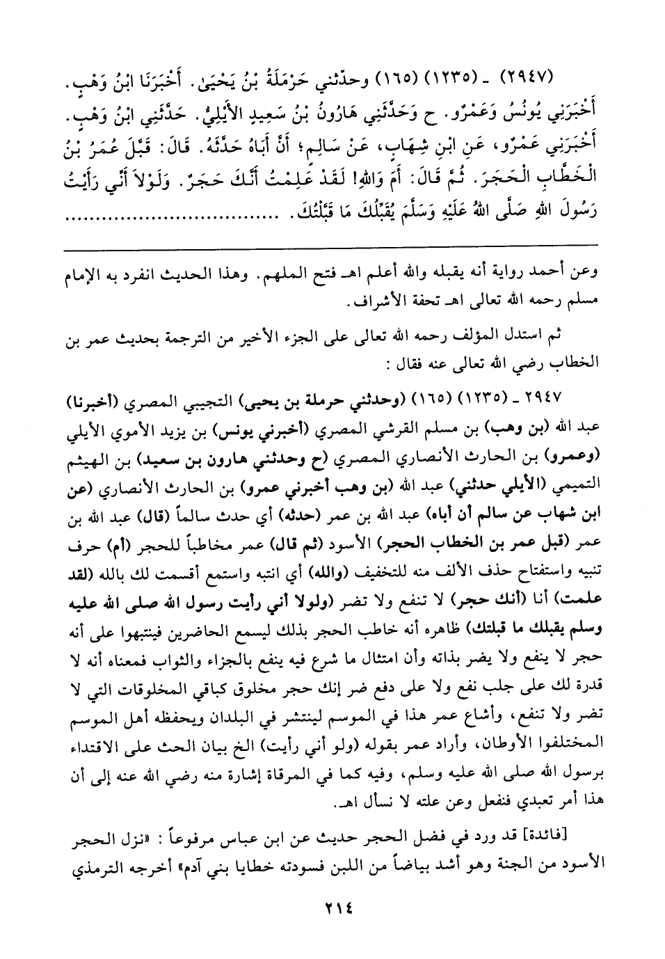 (٢٩٤٧) - (١٢٣٥) (١٦٥) وَحَدَّثَنِي حَرْمَلَةُ بْنُ يَحْيَى. أَخْبَرَنَا ابْنُ وَهْبٍ. أَخْبَرَنِي يُونُسُ وَعَمْرٌو. ح وَحَدَّثَنِي هَارُونُ بْنُ سَعِيدٍ الأَيلِيُّ. حَدَّثَنِي ابْنُ وَهْبٍ. أَخْبَرَنِي عَمْرٌو، عَنِ ابْنِ شِهَابٍ، عَنْ سَالِمٍ؛ أَنَّ أَبَاهُ حَدَّثَهُ. قَال: قَبَّلَ عُمَرُ بْنُ الْخَطَّابِ الْحَجَرَ. ثُمَّ قَال: أَمَ وَاللَّهِ! لَقَدْ عَلِمْتُ أَنَّكَ حَجَرٌ. وَلَوْلا أَنِّي رَأَيتُ رَسُولَ اللهِ صلى الله عليه وسلم يُقَبِّلُكَ مَا قَبَّلْتُكَ