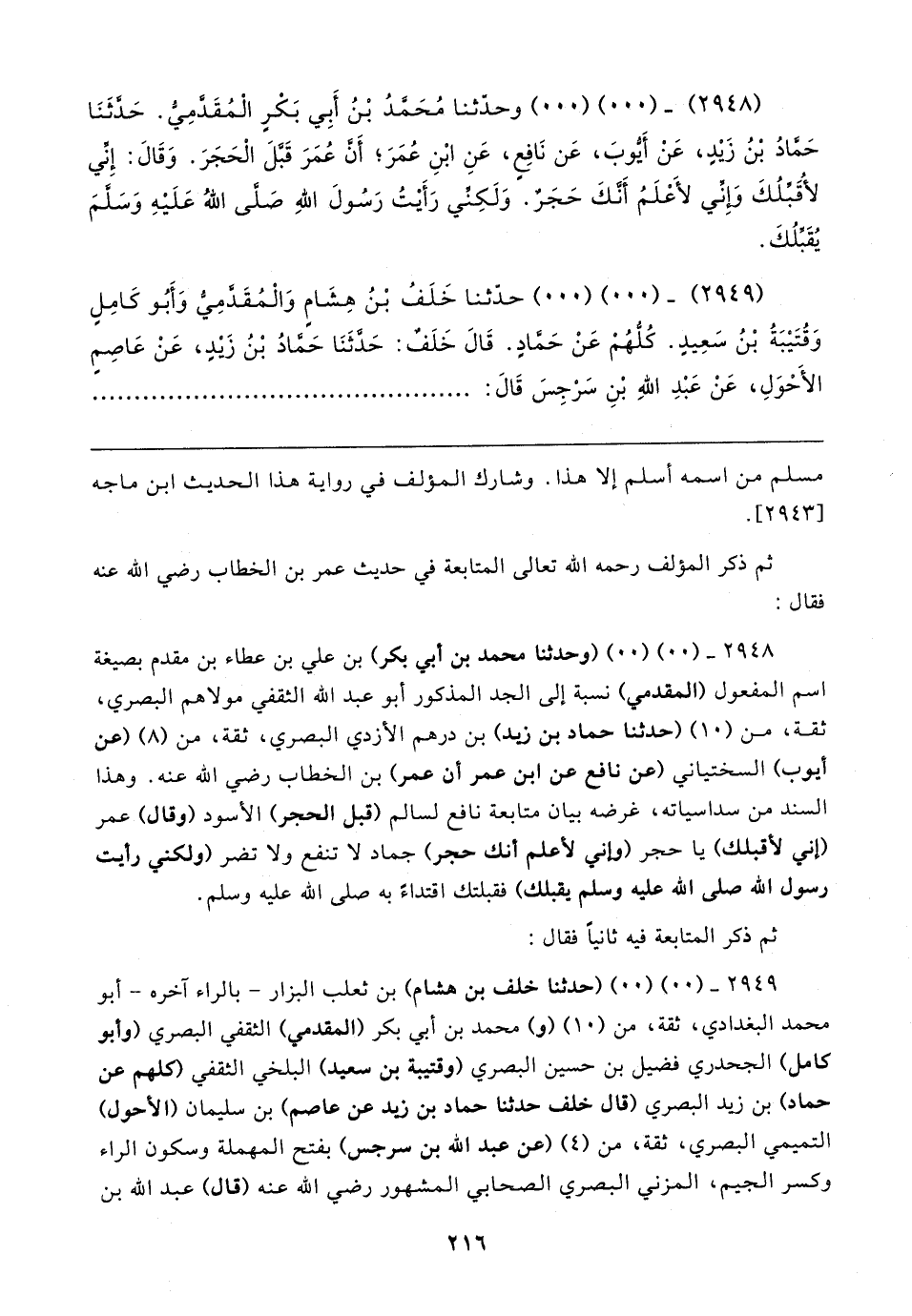 ٢٩٤٨ - (٠٠) (٠٠) (وحدثنا محمد بن أبي بكر) بن علي بن عطاء بن مقدم بصيغة اسم المفعول (المقدمي) نسبة إلى الجد المذكور أبو عبد الله الثقفي مولاهم البصري، ثقة، من (١٠) (حدثنا حماد بن زيد) بن درهم الأزدي البصري، ثقة، من (٨) (عن أيوب) السختياني (عن نافع عن ابن عمر أن عمر) بن الخطاب رضي الله عنه. وهذا السند من سداسياته، غرضه بيان متابعة نافع لسالم (قبل الحجر) الأسود (وقال) عمر (إني لأقبلك) يا حجر (وإني لأعلم أنك حجر) جماد لا تنفع ولا تضر (ولكني رأيت رسول الله صلى الله عليه وسلم يقبلك) فقبلتك اقتداءً به صلى الله عليه وسلم.