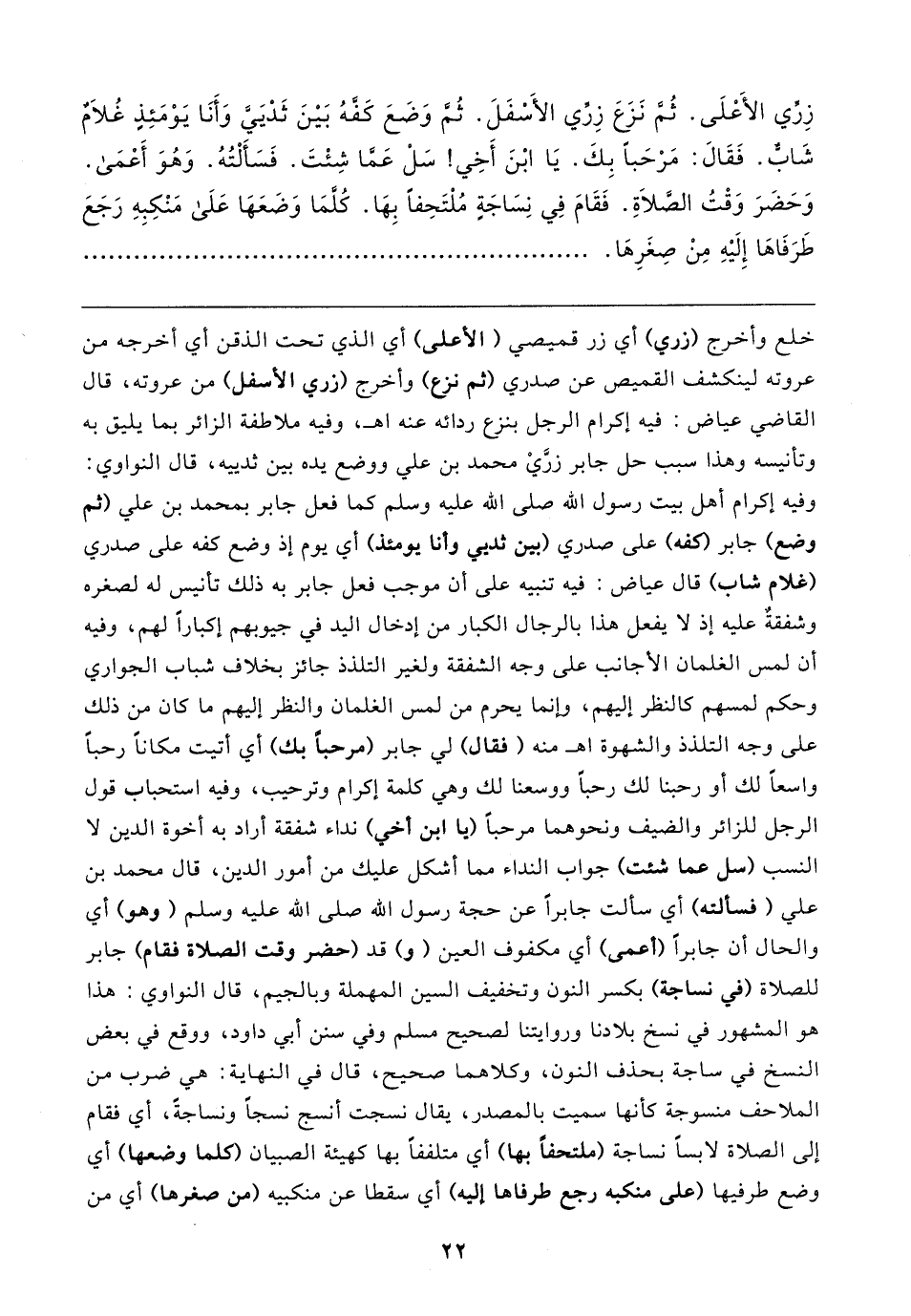 خلع وأخرج (زري) أي زر قميصي (الأعلى) أي الَّذي تحت الذقن أي أخرجه من عروته لينكشف القميص عن صدري (ثم نزع) وأخرج (زري الأسفل) من عروته، قال القاضي عياض: فيه إكرام الرجل بنزع ردائه عنه اهـ، وفيه ملاطفة الزائر بما يليق به وتأنيسه وهذا سبب حل جابر زرَّي محمد بن علي ووضع يده بين ثدييه، قال النواوي: وفيه إكرام أهل بيت رسول الله صلى الله عليه وسلم كما فعل جابر بمحمد بن علي (ثم وضع (جابر كفه) على صدري (بين ثديي وأنا يومئذ) أي يوم إذ وضع كفه على صدري (غلام شاب) قال عياض: فيه تنبيه على أن موجب فعل جابر به ذلك تانيس له لصغره وشفقةٌ عليه إذ لا يفعل هذا بالرجال الكبار من إدخال اليد في جيوبهم إكبارًا لهم، وفيه أن لمس الغلمان الأجانب على وجه الشفقة ولغير التلذذ جائز بخلاف شباب الجواري وحكم لمسهم كالنظر إليهم، وإنما يحرم من لمس الغلمان والنظر إليهم ما كان من ذلك على وجه التلذذ والشهوة اهـ منه (فقال) لي جابر (مرحبًا بك) أي أتيت مكانًا رحبًا واسعًا لك أو رحبنا لك رحبًا ووسعنا لك وهي كلمة إكرام وترحيب، وفيه استحباب قول الرجل للزائر والضيف ونحوهما مرحبًا (با ابن أخي) نداء شفقة أراد به أخوة الدين لا النسب (سل عما شئت) جواب النداء مما أشكل عليك من أمور الدين، قال محمد بن علي (فسألته) أي سألت جابرًا عن حجة رسول الله صلى الله عليه وسلم (وهو) أي والحال أن جابرًا (أعمى) أي مكفوف العين (و) قد (حضر وقت الصلاة فقام) جابر للصلاة (في نساجة) بكسر النون وتخفيف السين المهملة وبالجيم، قال النواوي: هذا هو المشهور في نسخ بلادنا وروايتنا لصحيح مسلم وفي سنن أبي داود، ووقع في بعض النسخ في ساجة بحذف النون، وكلاهما صحيح، قال في النهاية: هي ضرب من الملاحف منسوجة كأنها سميت بالمصدر، يقال نسجت أنسج نسجًا ونساجةً، أي فقام إلى الصلاة لابسًا نساجة (ملتحفًا بها) أي متلففًا بها كهيئة الصبيان (كلما وضعها) أي وضع طرفيها (على منكبه رجع طرفاها إليه) أي سقطا عن منكبيه (من صغرها) أي من