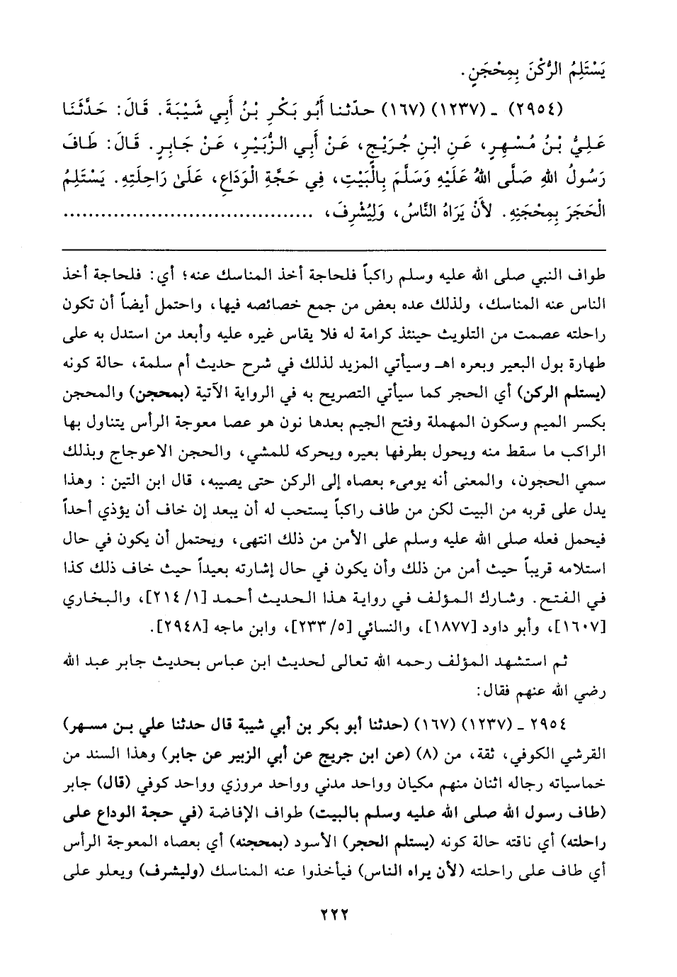 ٢٩٥٤ - (١٢٣٧) (١٦٧) (حدثنا أبو بكر بن أبي شيبة قال حدثنا علي بن مسهر) القرشي الكوفي، ثقة، من (٨) (عن ابن جريج عن أبي الزبير عن جابر) وهذا السند من خماسياته رجاله اثنان منهم مكيان وواحد مدني وواحد مروزي وواحد كوفي (قال) جابر (طاف رسول الله صلى الله عليه وسلم بالبيت) طواف الإفاضة (في حجة الوداع على راحلته) أي ناقته حالة كونه (يستلم الحجر) الأسود (بمحجنه) أي بعصاه المعوجة الرأس أي طاف على راحلته (لأن يراه الناس) فيأخذوا عنه المناسك (وليشرف) ويعلو على