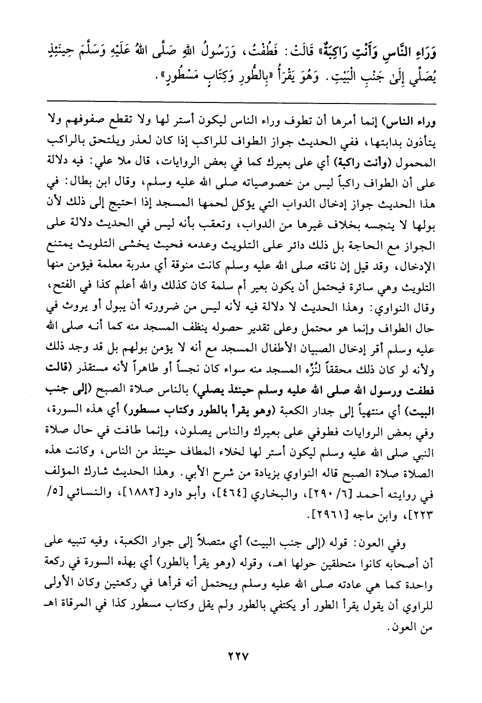 وَرَاءِ النَّاسِ وَأَنْتِ رَاكبَةٌ" قَالتْ: فَطُفْتُ، وَرَسُولُ اللهِ صَلَّى اللهُ عَلَيهِ وَسَلَّمَ حِينَئِذٍ يُصَلِّي إِلَى جَنْبِ الْبَيتِ. وَهُوَ يَقْرَأُ "بِالطُّورِ وَكِتَابٍ مَسْطُورٍ"