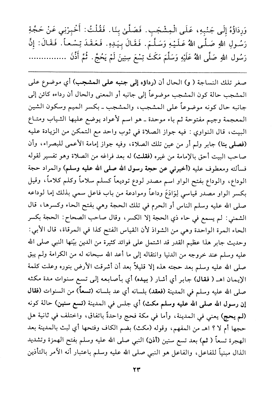 صغر تلك النساجة (و) الحال أن (رداوه إلى جنبه على المشجب) أي موضوع على المشجب حالة كون المشجب موضوعًا إلى جانبه أو المعنى والحال أن رداءه كائن إلى جانبه حال كونه موضوعًا على المشجب، والمشجب -بكسر الميم وسكون الشين المعجمة وجيم مفتوحة ثم باء موحدة- هو اسم لأعواد يوضع عليها الثياب ومتاع البيت، قال النواوي: فيه جواز الصلاة في ثوب واحد مع التمكن من الزيادة عليه (فصلى بنا) جابر ولم أر من عين تلك الصلاة، وفيه جواز إمامة الأعمى للبصراء، وأن صاحب البيت أحق بالإمامة من غيره (فقلت) له بعد فراغه من الصلاة وهو تفسير لقوله فسألته ومعطوف عليه (أخبرني عن حجة رسول الله صلى الله عليه وسلم) والمراد حجة الوداع، والوداع بفتح الواو اسم مصدر لوح توديعًا كسلم سلامًا وكلم كلامًا، وقيل بكسر الواو مصدر قياسي لِوَادَعَ وداعًا وموادعة من باب فاعل سمي بذلك إما لوداعه صلى الله عليه وسلم الناس أو الحرم في تلك الحجة وهي بفتح الحاء وكسرها، قال الشمني: لم يسمع في حاء ذي الحجة إلَّا الكسر، وقال صاحب الصحاح: الحجة بكسر الحاء المرة الواحدة وهي من الشواذ لأن القياس الفتح كذا في المرقاة، قال الأبي: وحديث جابر هذا عظيم القدر قد اشتمل على فوائد كثيرة من الدين بيّنها النبي صلى الله عليه وسلم عند خروجه من الدنيا وانتقاله إلى ما أعبد الله سبحانه له من الكرامة ولم يبق صلى الله عليه وسلم بعد حجته هذه إلَّا قليلًا بعد أن أشرقت الأرض بنوره وعلت كلمة الإيمان اهـ (فقال) جابر أي أشار (بيده) أي بأصابعه إلى تسع سنوات مدة مكثه صلى الله عليه وسلم في المدينة (فعقد) بلسانه أي عد بلسانه (تسعًا) من السنوات (فقال إن رسول الله صلى الله عليه وسلم مكث) أي جلس في المدينة (تسع سنين) حالة كونه (لم يحج) يعني في المدينة، وأما في مكة فحج واحدةً باتفاق، واختلف في ثانية هل حجها أم لا؟ اهـ من المفهم، وقوله (مكث) بضم الكاف وفتحها أي لبث بالمدينة بعد الهجرة تسعًا (ثم) بعد تسع سنين (أذن) النبي صلى الله عليه وسلم بفتح الهمزة وتشديد الذال مبنيًّا للفاعل، والفاعل هو النبي صلى الله عليه وسلم باعتبار أنَّه الآمر بالتأذين