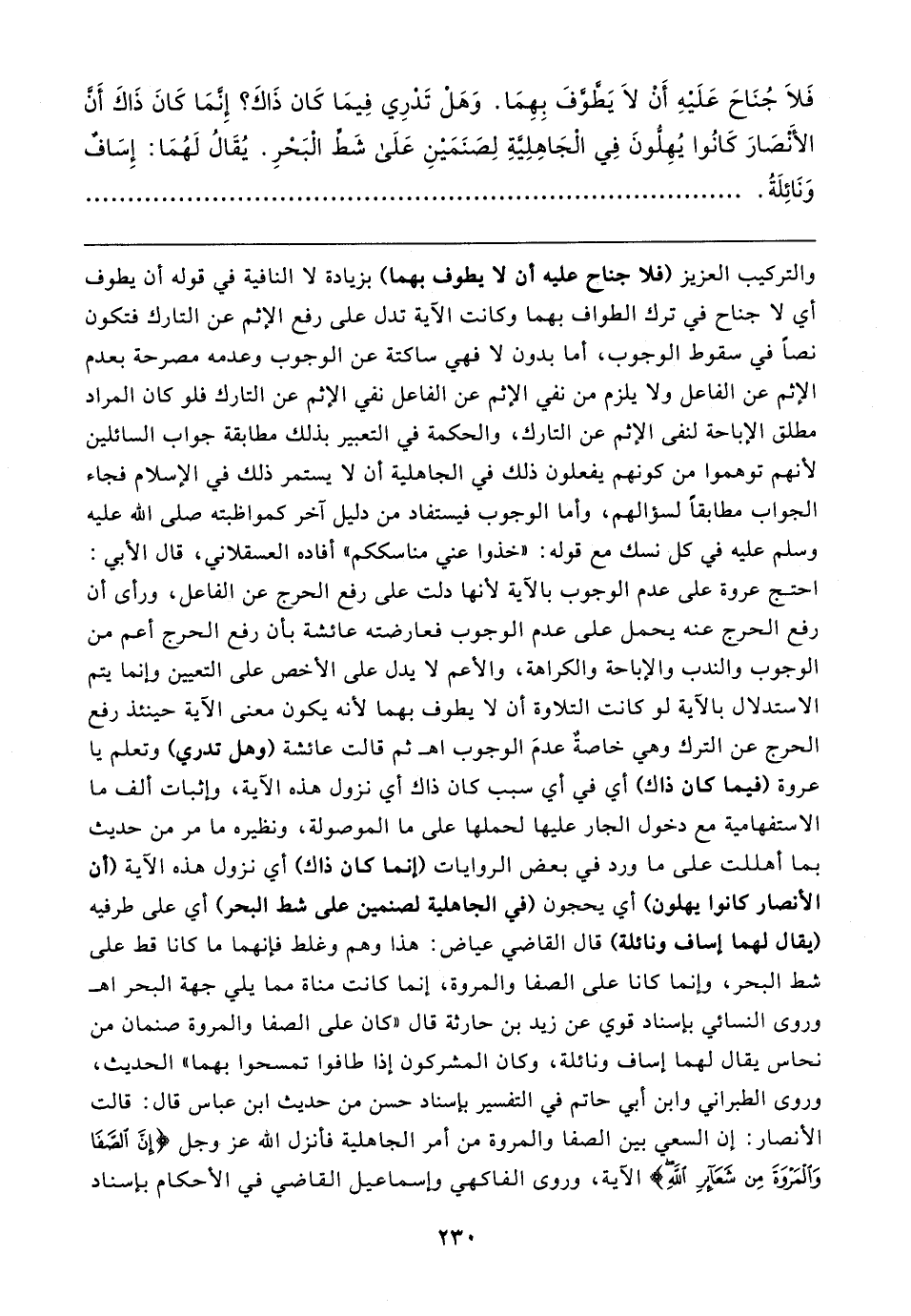 فَلَا جُنَاحَ عَلَيهِ أَنْ لَا يَطَّوَّفَ بِهِمَا. وَهَلْ تَدْرِي فِيمَا كَان ذَاكَ؟ إِنَّمَا كَانَ ذَاكَ أَنَّ الأَنْصَارَ كَانُوا يُهِلُّونَ فِي الْجَاهِلِيَّةِ لِصَنَمَينِ عَلَى شَطِّ الْبَحْرِ. يُقَالُ لَهُمَا: إِسَافٌ وَنَائِلَةُ