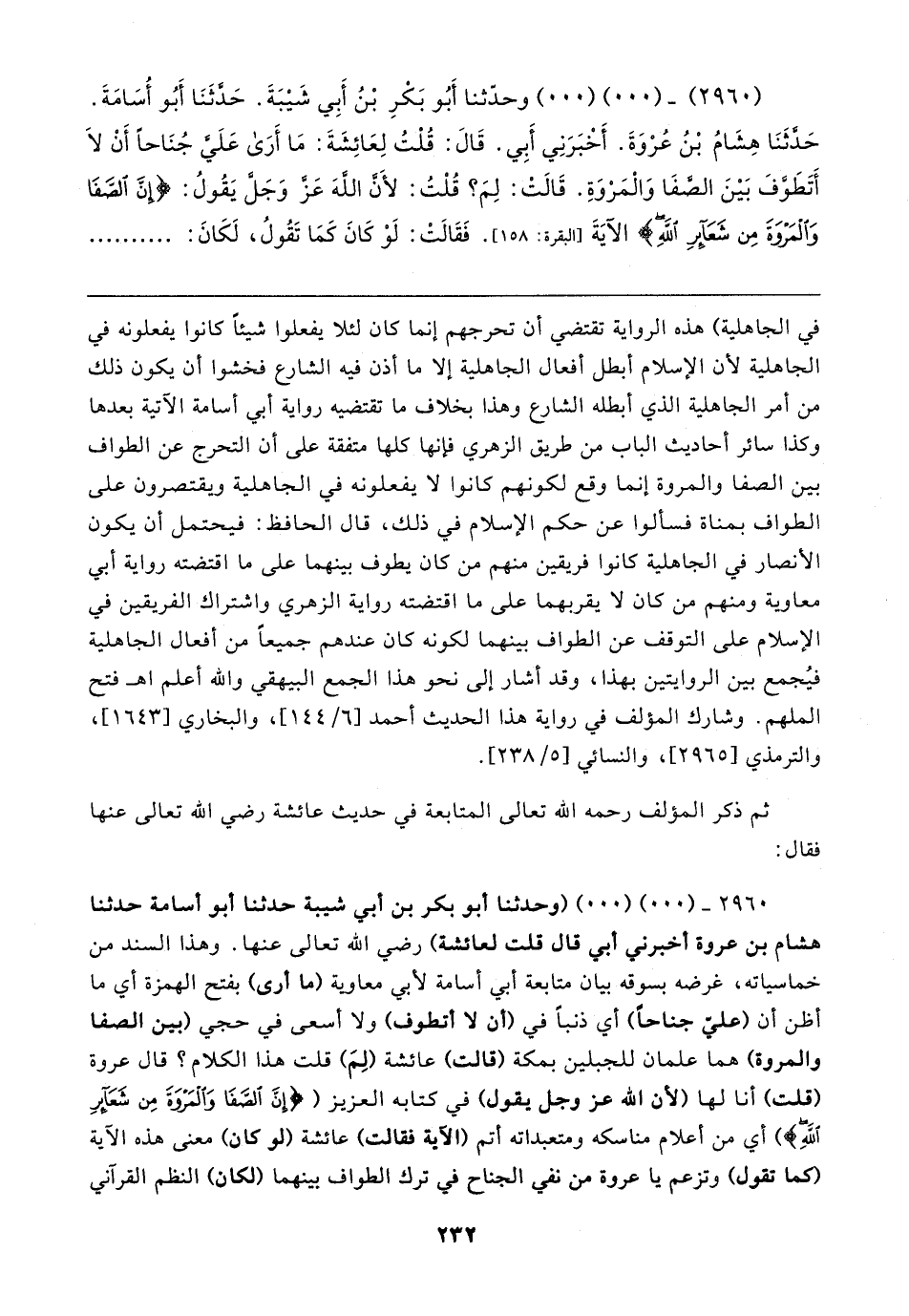 (٢٩٦٠) - (٠٠) (٠٠) وحدّثنا أَبُو بَكْرِ بْنُ أَبِي شَيبَةَ. حَدَّثَنَا أَبُو أُسَامَةَ. حَدَّثَنَا هِشَامُ بْنُ عُرْوَةَ. أَخْبَرَنِي أبِي. قَال: قُلْتُ لِعَائِشَةَ: مَا أَرَى عَلَيَّ جُنَاحًا أَنْ لَا أَتَطَوَّفَ بَينَ الصَّفَا وَالْمَرْوَةِ. قَالتْ: لِمَ؟ قُلْتُ: لأَنَّ اللهَ عَزَّ وَجَلَّ يَقُولُ: {إِنَّ الصَّفَا وَالْمَرْوَةَ مِنْ شَعَائِرِ اللَّهِ} الآيَةَ [البقرة: ١٥٨]. فَقَالتْ: لَوْ كَانَ كَمَا تَقُولُ، لَكَان: