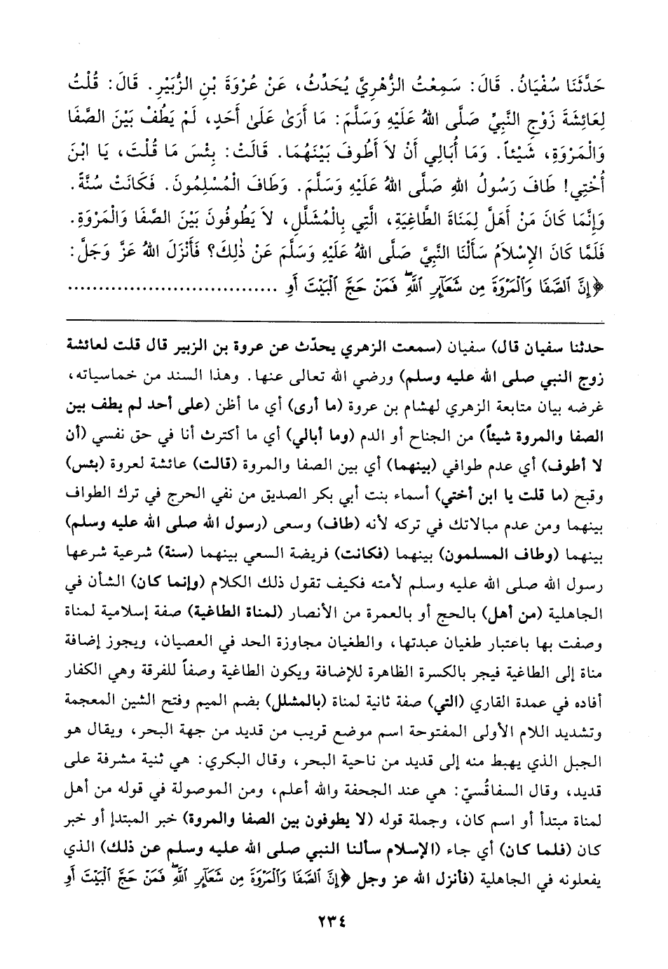 حَدَّثَنَا سُفْيَانُ. قَال: سَمِعْتُ الزُّهْرِيَّ يُحَدِّثُ، عَنْ عُرْوَةَ بْنِ الزُّبَيرِ. قَال: قُلْتُ لِعَائِشَةَ زَوْجِ النَّبِيِّ صَلَّى اللهُ عَلَيهِ وَسَلَّمَ: مَا أَرَى عَلَى أحَدٍ، لَمْ يَطُفْ بَينَ الصَّفَا وَالْمَرْوَةِ، شَيئًا. وَمَا أُبَالِي أَنْ لَا أَطُوفَ بَينَهُمَا. قَالتْ: بِئْسَ مَا قُلْتَ، يَا ابْنَ أُخْتِي! طَافَ رَسُولُ اللهِ صَلَّى اللهُ عَلَيهِ وَسَلَّمَ. وَطَافَ الْمُسْلِمُونَ. فَكَانَتْ سُنَّةً. وَإِنَّمَا كَانَ مَنْ أَهَلَّ لِمَنَاةَ الطَّاغِيَةِ، الَّتِي بِالْمُشَلَّلِ، لَا يَطُوفُونَ بَينَ الصَّفَا وَالْمَرْوَةِ. فَلَمَّا كَانَ الإِسْلامُ سَأَلْنَا النَّبِيَّ صَلَّى اللهُ عَلَيهِ وَسَلَّمَ عَنْ ذلِكَ؟ فَأَنْزَلَ اللهُ عَزَّ وَجَلَّ: {إِنَّ الصَّفَا وَالْمَرْوَةَ مِنْ شَعَائِرِ اللَّهِ فَمَنْ حَجَّ الْبَيتَ أَو