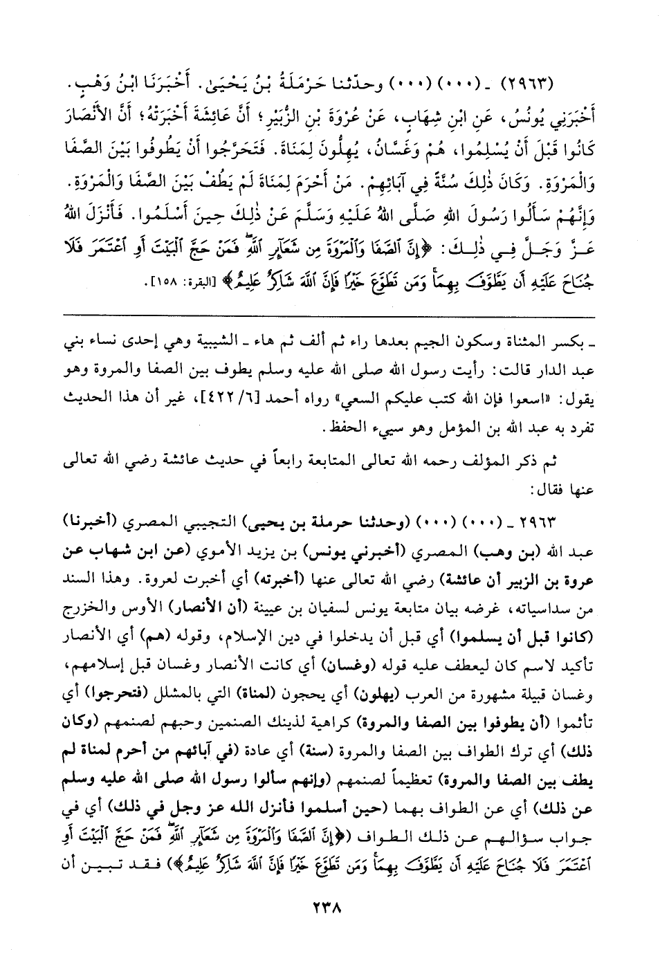 (٢٩٦٣) - (٠٠) (٠٠) وحدّثنا حَرْمَلَةُ بْنُ يَحْيَى. أَخْبَرَنَا ابْنُ وَهْبٍ. أَخْبَرَنِي يُونُسُ، عَنِ ابْنِ شِهَابٍ، عَنْ عُرْوَةَ بْنِ الزُّبَيرِ؛ أَن عَائِشَةَ أَخبَرَتْهُ؛ أَنَّ الأنْصَارَ كَانُوا قَبْلَ أَنْ يُسْلِمُوا، هُمْ وَغَسَّانُ، يُهِلُّونَ لِمَنَاةَ. فَتَحَرَّجُوا أَنْ يَطُوفُوا بَينَ الصَّفَا وَالْمَرْوَةِ. وَكَانَ ذلِكَ سُنَّةَ فِي آبَائِهِمْ. مَنْ أَحْرَمَ لِمَنَاةَ لَمْ يَطُفْ بَينَ الصَّفَا وَالْمَرْوَةِ. وَإِنَّهُمْ سَأَلُوا رَسُولَ اللهِ صَلَّى اللهُ عَلَيهِ وَسَلَّمَ عَنْ ذلِكَ حِينَ أَسْلَمُوا. فَأَنْزَلَ اللهُ عَزَّ وَجَلَّ فِي ذلِكَ: {إِنَّ الصَّفَا وَالْمَرْوَةَ مِنْ شَعَائِرِ اللَّهِ فَمَنْ حَجَّ الْبَيتَ أَو اعْتَمَرَ فَلَا جُنَاحَ عَلَيهِ أَنْ يَطَّوَّفَ بِهِمَا وَمَنْ تَطَوَّعَ خَيرًا فَإِنَّ اللَّهَ شَاكِرٌ عَلِيمٌ} [البقرة: ١٥٨]