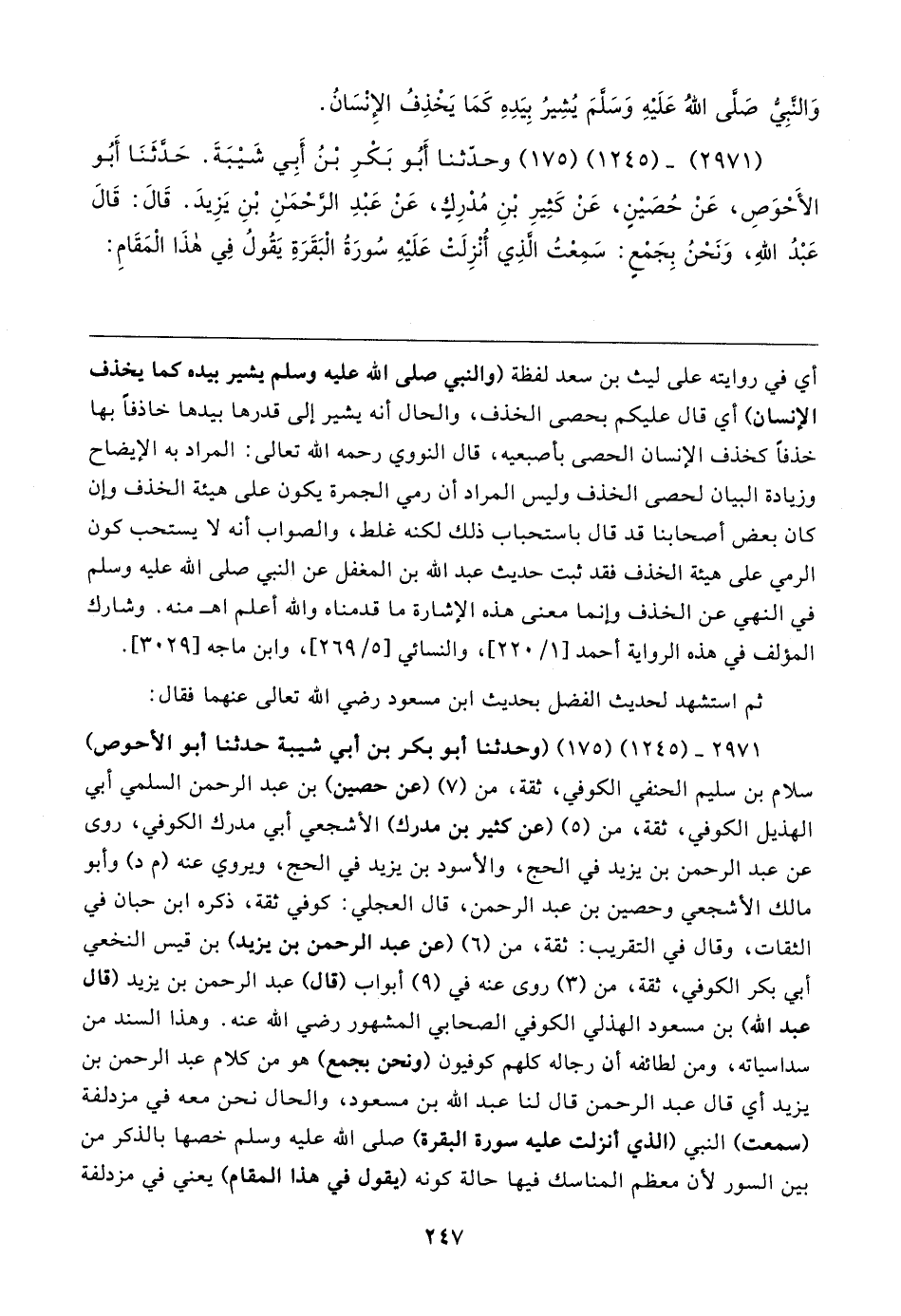 ٢٩٧١ - (١٢٤٥) (١٧٥) (وحدثنا أبو بكر بن أبي شيبة حدثنا أبو الأحوص) سلام بن سليم الحنفي الكوفي، ثقة، من (٧) (عن حصين) بن عبد الرحمن السلمي أبي الهذيل الكوفي، ثقة، من (٥) (عن كثير بن مدرك) الأشجعي أبي مدرك الكوفي، روى عن عبد الرحمن بن يزيد في الحج، والأسود بن يزيد في الحج، ويروي عنه (م د) وأبو مالك الأشجعي وحصين بن عبد الرحمن، قال العجلي: كوفي ثقة، ذكره ابن حبان في الثقات، وقال في التقريب: ثقة، من (٦) (عن عبد الرحمن بن يزيد) بن قيس النخعي أبي بكر الكوفي، ثقة، من (٣) روى عنه في (٩) أبواب (قال) عبد الرحمن بن يزيد (قال عبد الله) بن مسعود الهذلي الكوفي الصحابي المشهور رضي الله عنه. وهذا السند من سداسياته، ومن لطائفه أن رجاله كلهم كوفيون (ونحن بجمع) هو من كلام عبد الرحمن بن يزيد أي قال عبد الرحمن قال لنا عبد الله بن مسعود، والحال نحن معه في مزدلفة (سمعت) النبي (الذي أنزلت عليه سورة البقرة) صلى الله عليه وسلم خصها بالذكر من بين السور لأن معظم المناسك فيها حالة كونه (يقول في هذا المقام) يعني في مزدلفة