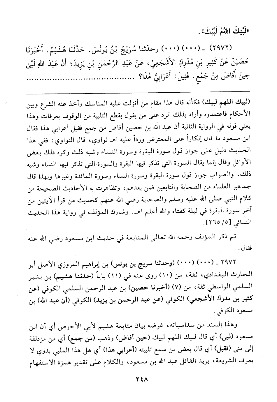(٢٩٧٢) - (٠٠) (٠٠) وحدّثنا سُرَيجُ بن يُونُسَ. حَدَّثَنَا هُشَيمٌ. أَخْبَرَنَا حُصَينٌ عَنْ كَثِيرِ بْنِ مُدْرِكٍ الأَشْجَعِيِّ، عَنْ عَبْدِ الرَّحْمَنِ بْنِ يَزِيدَ؛ أَن عَبْدَ اللهِ لَبَّى حِينَ أَفَاضَ مِنْ جَمْعٍ. فَقِيلَ: أَعْرَابِيٌّ هذَا؟