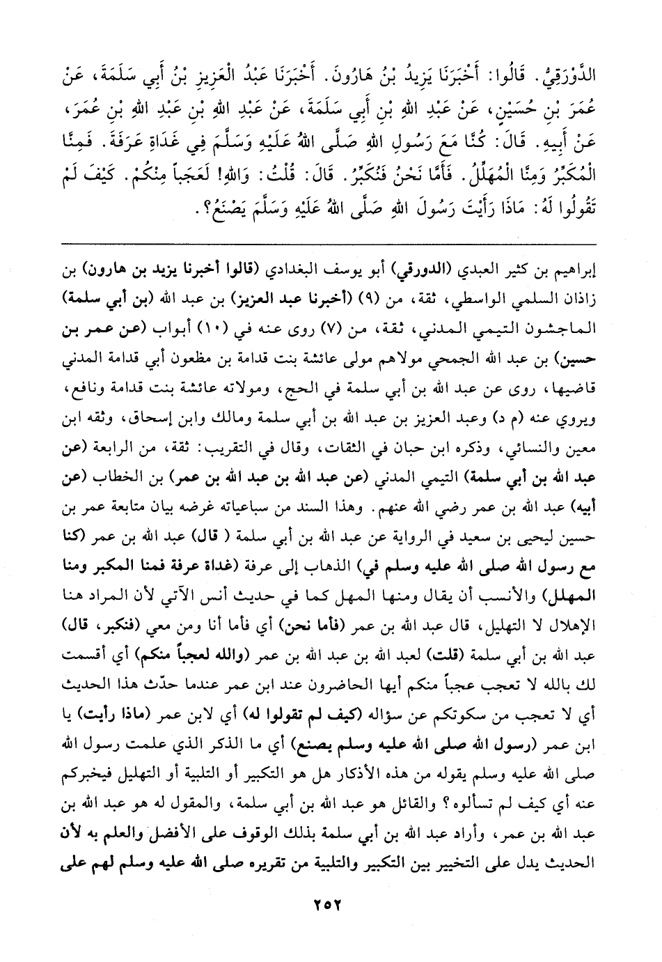 الدَّوْرَقِيُّ. قَالُوا: أَخْبَرَنَا يَزِيدُ بْنُ هَارُونَ. أَخْبَرَنَا عَبْدُ الْعَزِيزِ بْنُ أَبِي سَلَمَةَ، عَنْ عُمَرَ بْنِ حُسَينٍ، عَنْ عَبْدِ اللهِ بْنِ أَبِي سَلَمَةَ، عَنْ عَبْدِ اللهِ بْنِ عَبْدِ اللهِ بْنِ عُمَرَ، عَنْ أَبِيهِ. قَال: كُنَّا مَعَ رَسُولِ اللهِ صَلَّى اللهُ عَلَيهِ وَسَلَّمَ فِي غَدَاةِ عَرَفَةَ. فَمِنَّا الْمُكَبِّرُ وَمِنَّا الْمُهَلِّلُ. فَأَمَّا نَحْنُ فَنُكَبِّرُ. قَال: قُلْتُ: وَاللهِ! لَعَجَبًا مِنْكُمْ. كَيفَ لَمْ تَقُولُوا لَهُ: مَاذَا رَأَيتَ رَسُولَ اللهِ صَلَّى اللهُ عَلَيهِ وَسَلَّمَ يَصْنَعُ؟