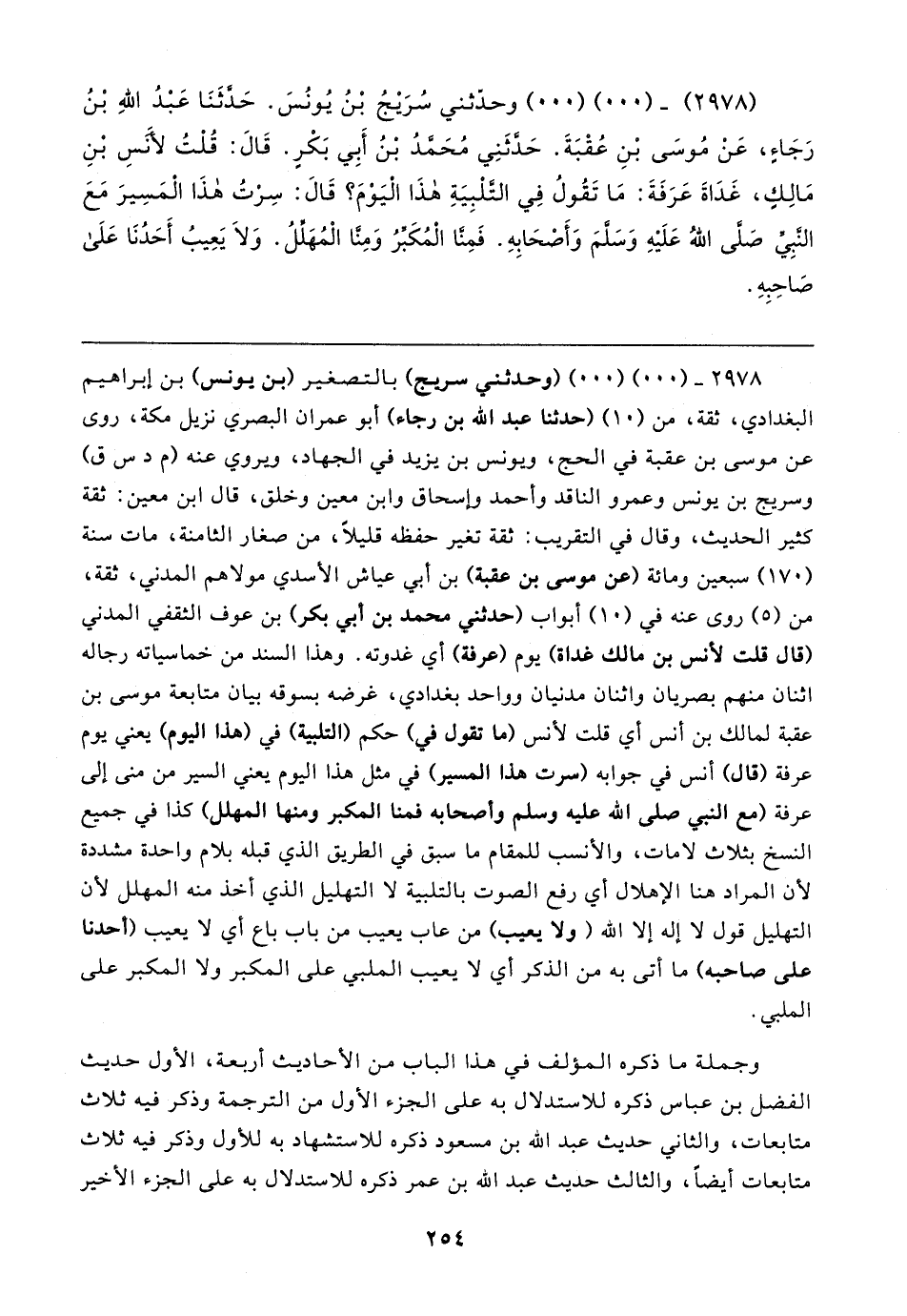 (٢٩٧٨) - (٠٠) (٠٠) وحدّثني سُرَيجُ بْنُ يُونُسَ. حَدَّثَنَا عَبْدُ اللهِ بْنُ رَجَاءٍ، عَنْ مُوسَى بْنِ عُقْبَةَ. حَدَّثَنِي مُحَمَّدُ بْنُ أَبِي بَكْرٍ. قَال: قُلْتُ لأَنَسِ بْنِ مَالِكٍ، غَدَاةَ عَرَفَةَ: مَا تَقُولُ فِي التَّلْبِيَةِ هذَا الْيَوْمَ؟ قَال: سِرْتُ هذَا الْمَسِيرَ مَعَ النَّبِيِّ صلَّى اللهُ عَلَيهِ وَسَلَّمَ وَأَصْحَابِهِ. فَمِنَّا الْمُكَبِّرُ وَمِنَّا الْمُهَلِّلُ. وَلَا يَعِيبُ أَحَدُنَا عَلَى صَاحِبِهِ