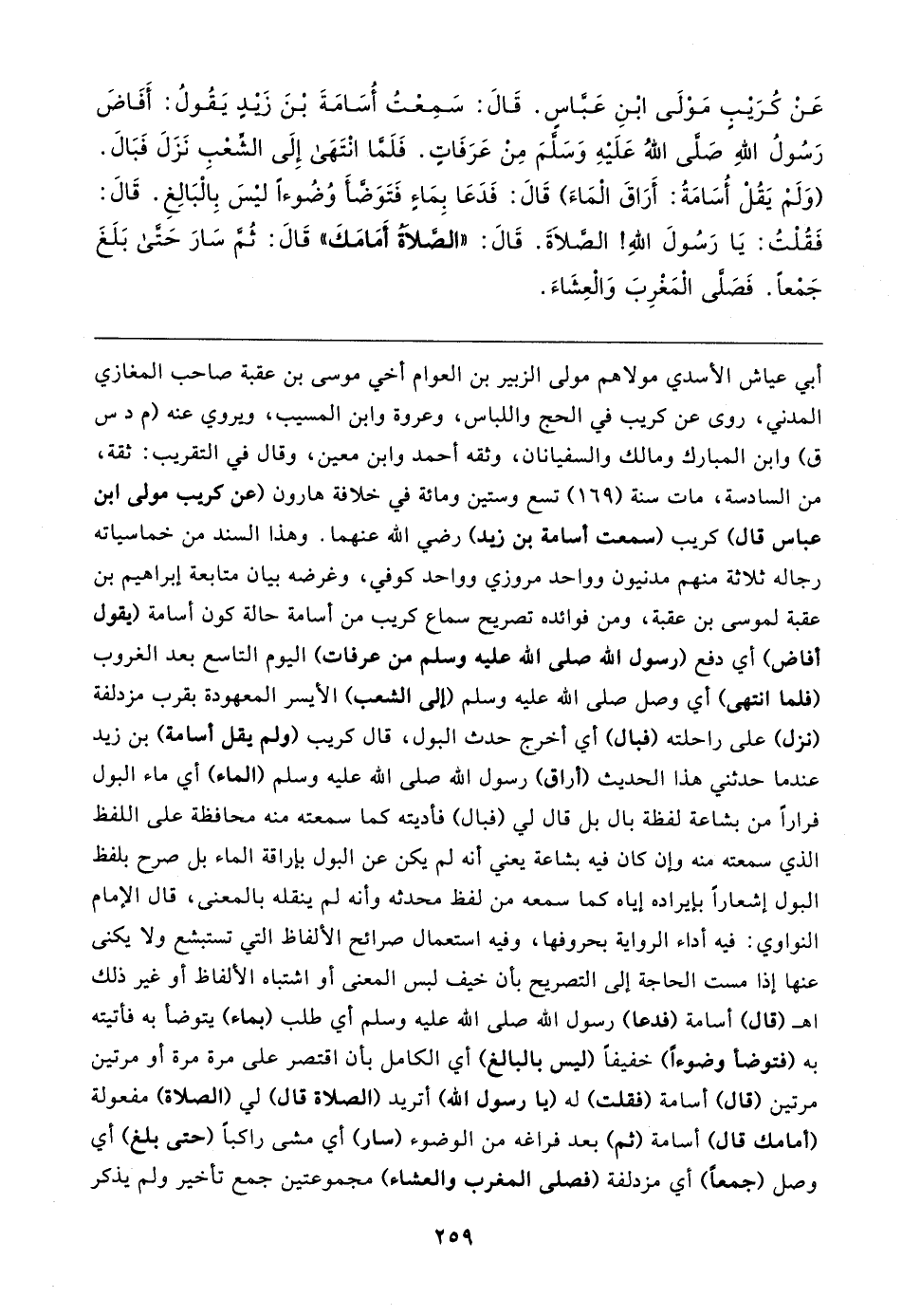 عَنْ كُرَيبٍ مَوْلَى ابْنِ عَبَّاسٍ. قَال: سَمِعْتُ أُسَامَةَ بْنَ زيدٍ يَقُولُ: أَفَاضَ رَسُولُ اللهِ صَلَّى اللهُ عَلَيهِ وَسَلَّمَ مِنْ عَرَفَاتٍ. فَلَمَّا انْتَهَى إِلَى الشِّعْبِ نَزَلَ فَبَال. (وَلَمْ يَقُلْ أُسَامَةُ: أَرَاقَ الْمَاءَ) قَال: فَدَعَا بِمَاءِ فَتَوَضَّأَ وُضُوءًا ليسَ بِالْبَالِغِ. قَال: فَقُلْتُ: يَا رَسُولَ اللهِ! الصَّلاةَ. قَال: "الصَّلاةُ أَمَامَكَ" قَال: ثُمَّ سَارَ حَتَّى بَلَغَ جَمْعًا. فَصَلَّى الْمَغْرِبَ وَالْعِشَاءَ