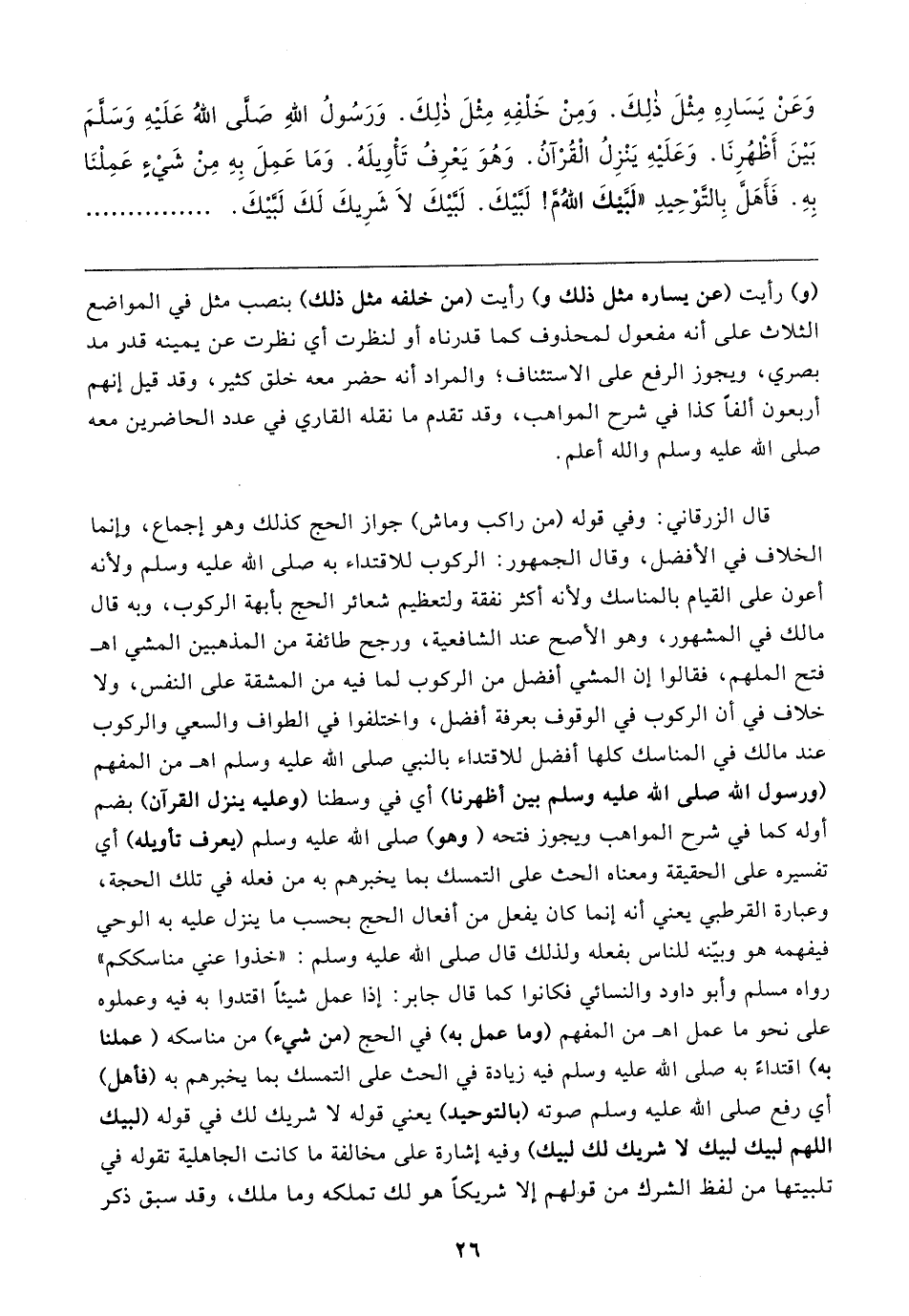 قال الزرقاني: وفي قوله (من راكب وماش) جواز الحج كذلك وهو إجماع، وإنما الخلاف في الأفضل، وقال الجمهور: الركوب للاقتداء به صلى الله عليه وسلم ولأنه أعون على القيام بالمناسك ولأنه أكثر نفقة ولتعظيم شعائر الحج بأبهة الركوب، وبه قال مالك في المشهور، وهو الأصح عند الشافعية، ورجح طائفة من المذهبين المشي اهـ فتح الملهم، فقالوا إن المشي أفضل من الركوب لما فيه من المشقة على النفس، ولا خلاف في أن الركوب في الوقوف بعرفة أفضل، واختلفوا في الطواف والسعي والركوب عند مالك في المناسك كلها أفضل للاقتداء بالنبي صلى الله عليه وسلم اهـ من المفهم (ورسول الله صلى الله عليه وسلم بين أظهرنا) أي في وسطنا (وعليه ينزل القرآن) بضم أوله كما في شرح المواهب ويجوز فتحه (وهو) صلى الله عليه وسلم (يعرف تأويله) أي تفسيره على الحقيقة ومعناه الحث على التمسك بما يخبرهم به من فعله في تلك الحجة، وعبارة القرطبي يعني أنَّه إنما كان يفعل من أفعال الحج بحسب ما ينزل عليه به الوحي فيفهمه هو وبيّنه للناس بفعله ولذلك قال صلى الله عليه وسلم: "خذوا عني مناسككم" رواه مسلم وأبو داود والنسائي فكانوا كما قال جابر: إذا عمل شيئًا اقتدوا به فيه وعملوه على نحو ما عمل اهـ من المفهم (وما عمل به) في الحج (من شيء) من مناسكه (عملنا به) اقتداءً به صلى الله عليه وسلم فيه زيادة في الحث على التمسك بما يخبرهم به (فأهل) أي رفع صلى الله عليه وسلم صوته (بالتوحيد) يعني قوله لا شريك لك في قوله (لبيك اللهم لبيك لبيك لا شريك لك لبيك) وفيه إشارة على مخالفة ما كانت الجاهلية تقوله في تلبيتها من لفظ الشرك من قولهم إلَّا شريكًا هو لك تملكه وما ملك، وقد سبق ذكر