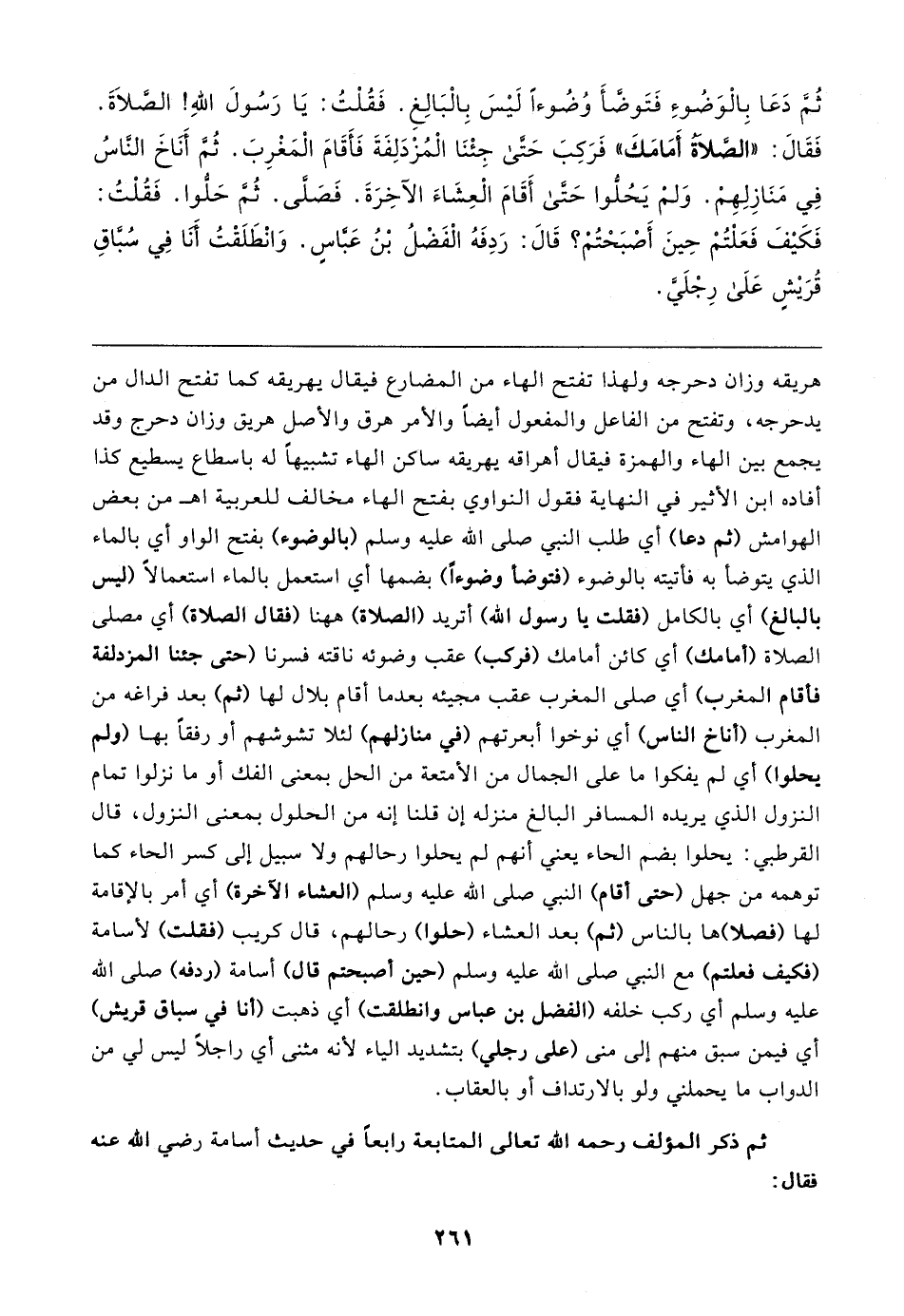 هريقه وزان دحرجه ولهذا تفتح الهاء من المضارع فيقال يهريقه كما تفتح الدال من يدحرجه، وتفتح من الفاعل والمفعول أيضًا والأمر هرق والأصل هريق وزان دحرج وقد يجمع بين الهاء والهمزة فيقال أهراقه يهريقه ساكن الهاء تشبيهًا له باسطاع يسطيع كذا أفاده ابن الأثير في النهاية فقول النواوي بفتح الهاء مخالف للعربية اهـ من بعض الهوامش (ثم دعا) أي طلب النبي صلى الله عليه وسلم (بالوضوء) بفتح الواو أي بالماء الذي يتوضأ به فأتيته بالوضوء (فتوضأ وضوءًا) بضمها أي استعمل بالماء استعمالًا (ليس بالبالغ) أي بالكامل (فقلت يا رسول الله) أتريد (الصلاة) ها هنا (فقال الصلاة) أي مصلى الصلاة (أمامك) أي كائن أمامك (فركب) عقب وضوئه ناقته فسرنا (حتى جئنا المزدلفة فأقام المغرب) أي صلى المغرب عقب مجيئه بعدما أقام بلال لها (ثم) بعد فراغه من المغرب (أناخ الناس) أي نوخوا أبعرتهم (في منازلهم) لئلا تشوشهم أو رفقًا بها (ولم يحلوا) أي لم يفكوا ما على الجمال من الأمتعة من الحل بمعنى الفك أو ما نزلوا تمام النزول الذي يريده المسافر البالغ منزله إن قلنا إنه من الحلول بمعنى النزول، قال القرطبي: يحلوا بضم الحاء يعني أنهم لم يحلوا رحالهم ولا سبيل إلى كسر الحاء كما توهمه من جهل (حتى أقام) النبي صلى الله عليه وسلم (العشاء الآخرة) أي أمر بالإقامة لها (فصلًا) ها بالناس (ثم) بعد العشاء (حلوا) رحالهم، قال كريب (فقلت) لأسامة (فكيف فعلتم) مع النبي صلى الله عليه وسلم (حبن أصبحتم قال) أسامة (ردفه) صلى الله عليه وسلم أي ركب خلفه (الفضل بن عباس وانطلقت) أي ذهبت (أنا في سباق قريش) أي فيمن سبق منهم إلى منى (على رجلي) بتشديد الياء لأنه مثنى أي راجلًا ليس لي من الدواب ما يحملني ولو بالارتداف أو بالعقاب.