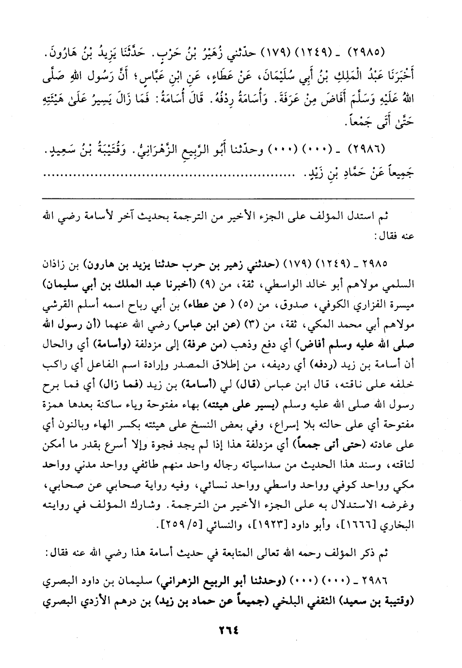 ٢٩٨٥ - (١٢٤٩) (١٧٩) (حدثني زهير بن حرب حدثنا يزيد بن هارون) بن زاذان السلمي مولاهم أبو خالد الواسطي، ثقة، من (٩) (أخبرنا عبد الملك بن أبي سليمان) ميسرة الفزاري الكوفي، صدوق، من (٥) (عن عطاء) بن أبي رباح اسمه أسلم القرشي مولاهم أبي محمد المكي، ثقة، من (٣) (عن ابن عباس) رضي الله عنهما (أن رسول الله صلى الله عليه وسلم أفاض) أي دفع وذهب (من عرفة) إلى مزدلفة (وأسامة) أي والحال أن أسامة بن زيد (ردفه) أي رديفه، من إطلاق المصدر وإرادة اسم الفاعل أي راكب خلفه على ناقته، قال ابن عباس (قال) لي (أسامة) بن زيد (فما زال) أي فما برح رسول الله صلى الله عليه وسلم (يسير على هيئته) بهاء مفتوحة وياء ساكنة بعدها همزة مفتوحة أي على حالته بلا إسراع، وفي بعض النسخ على هيئته بكسر الهاء وبالنون أي على عادته (حتى أتى جمعًا) أي مزدلفة هذا إذا لم يجد فجوة وإلا أسرع بقدر ما أمكن لناقته، وسند هذا الحديث من سداسياته رجاله واحد منهم طائفي وواحد مدني وواحد مكي وواحد كوفي وواحد واسطي وواحد نسائي، وفيه رواية صحابي عن صحابي، وغرضه الاستدلال به على الجزء الأخير من الترجمة. وشارك المؤلف في روايته البخاري [١٦٦٦]، وأبو داود [١٩٢٣]، والنسائي [٥/ ٢٥٩].