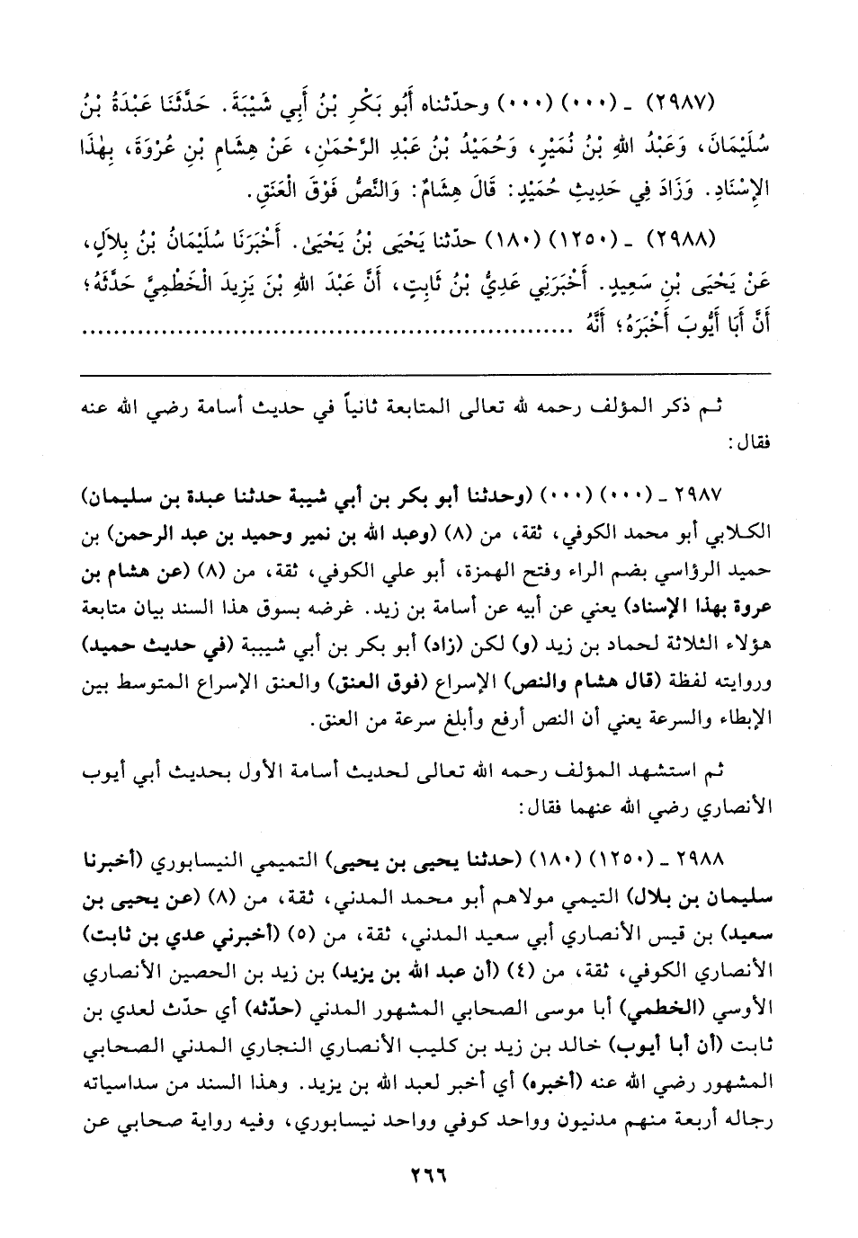 ٢٩٨٧ - (٠٠) (٠٠) (وحدثنا أبو بكر بن أبي شيبة حدثنا عبدة بن سليمان) الكلابي أبو محمد الكوفي، ثقة، من (٨) (وعبد الله بن نمير وحميد بن عبد الرحمن) بن حميد الرؤاسي بضم الراء وفتح الهمزة، أبو علي الكوفي، ثقة، من (٨) (عن هشام بن عروة بهذا الإسناد) يعني عن أبيه عن أسامة بن زيد. غرضه بسوق هذا السند بيان متابعة هؤلاء الثلاثة لحماد بن زيد (و) لكن (زاد) أبو بكر بن أبي شيببة (في حديث حميد) وروايته لفظة (قال هشام والنص) الإسراع (فوق العنق) والعنق الإسراع المتوسط بين الإبطاء والسرعة يعني أن النص أرفع وأبلغ سرعة من العنق.