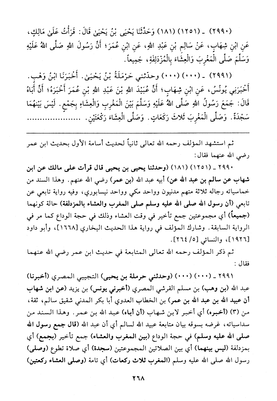 ٢٩٩١ - (٠٠) (٠٠) (وحدثني حرملة بن يحيى) التجيبي المصري (أخبرنا) عبد الله (بن وهب) بن مسلم القرشي المصري (أخبرني يونس) بن يزيد (عن ابن شهاب أن عبيد الله بن عبد الله بن عمر) بن الخطاب العدوي أبا بكر المدني شقيق سالم، ثقة، من (٣) (أخبره) أي أخبر لابن شهاب (أن أباه) عبد الله بن عمر. وهذا السند من سداسياته، غرضه بسوقه بيان متابعة عبيد الله لسالم أي أن عبد الله (قال جمع رسول الله صلى الله عليه وسلم) في حجة الوداع (بين المغرب والعشاء) جمع تأخير (بجمع) أي بمزدلفة (ليس بينهما) أي بين الصلاتين المجموعتين (سجدة) أي صلاة تطوع (وصلى) رسول الله صلى الله عليه وسلم (المغرب ثلاث ركعات) أي تامة (وصلى العشاء ركعتين)