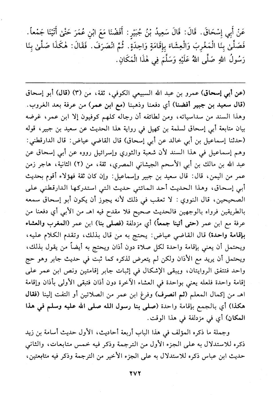 عَنْ أَبِي إِسْحَاقَ. قَال: قَال سَعِيدُ بْنُ جُبَيرٍ: أَفَضْنَا مَعَ ابْنِ عُمَرَ حَتَّى أَتَينَا جَمْعًا. فَصَلَّى بِنَا الْمَغْرِبَ وَالْعِشَاءَ بِإِقَامَةٍ وَاحِدَةٍ. ثُمَّ انْصَرَفَ. فَقَال: هكَذَا صَلَّى بِنَا رَسُولُ اللهِ - صَلَّى اللهُ عَلَيهِ وَسَلَّمَ فِي هذَا الْمَكَانِ