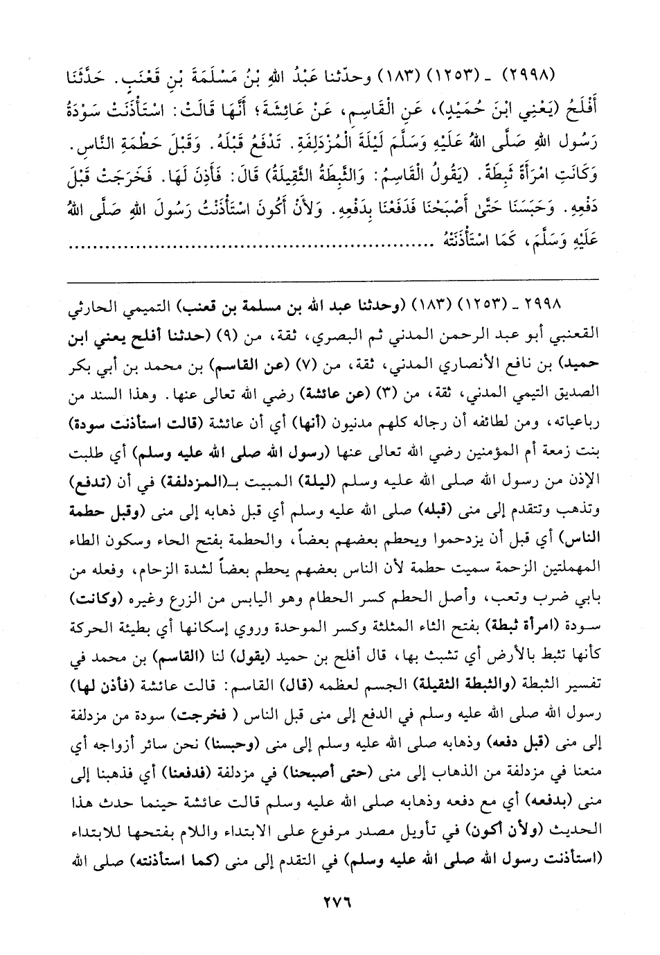 (٢٩٩٨) - (١٢٥٣) (١٨٣) وحدّثنا عَبْدُ اللهِ بْنُ مَسْلَمَةَ بْنِ قَعْنَبٍ. حَدَّثَنَا أَفْلَحُ (يَعْنِي ابْنَ حُمَيدٍ)، عَنِ الْقَاسِمِ، عَنْ عَائِشَةَ؛ أَنَّهَا قَالتْ: اسْتَأْذَنَتْ سَوْدَةُ رَسُول اللهِ - صَلَّى اللهُ عَلَيهِ وَسَلَّمَ - لَيلَةَ الْمُزْدَلِفَةِ. تَدْفَعُ قَبْلَهُ. وَقَبْلَ حَطْمَةِ النَّاسِ. وَكَانَتِ امْرَأَةً ثَبِطَةً. (يَقُولُ الْقَاسِمُ: وَالثَّبِطَةُ الثَّقِيلَةُ) قَال: فَأَذِنَ لَهَا. فَخَرَجَتْ قَبْلَ دَفْعِهِ. وَحَبَسَنَا حَتَّى أَصْبَحْنَا فَدَفَعْنَا بِدَفْعِهِ. وَلأَنْ أَكُونَ اسْتَأْذَنْتُ رَسُولَ اللهِ - صَلَّى اللهُ عَلَيهِ وَسَلَّمَ، كَمَا اسْتَأْذَنَتْهُ