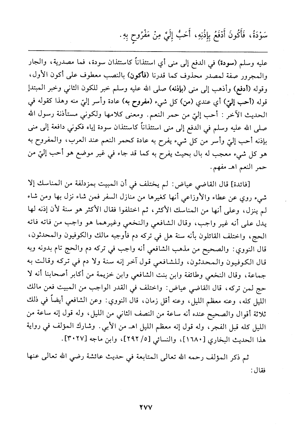 عليه وسلم - (سودة) في الدفع إلى مني أي استئذانًا كاستئذان سودة، فما مصدرية، والجار والمجرور صفة لمصدر محذوف كما قدرنا (فأكون) بالنصب معطوف على أكون الأول، وقوله (أدفع) وأذهب إلى منى (بإذنه) - صلى الله عليه وسلم - خبر للكون الثاني وخبر المبتدإ قوله (أحب إليّ) أي عندي (من) كل شيء (مفروح به) عادة وأسر إليّ منه وهذا كقوله في الحديث الآخر: أحب إليّ من حمر النعم. ومعنى كلامها ولكوني مستأذنة رسول الله - صلى الله عليه وسلم - في الدفع إلى منى استئذانًا كاستئذان سودة إياه فكوني دافعة إلى منى بإذنه أحب إليّ وأسر من كل شيء يفرح به عادة كحمر النعم عند العرب، والمفروح به هو كل شيء معجب له بال بحيث يفرح به كما قد جاء في غير موضع هو أحب إليّ من حمر النعم اهـ مفهم.