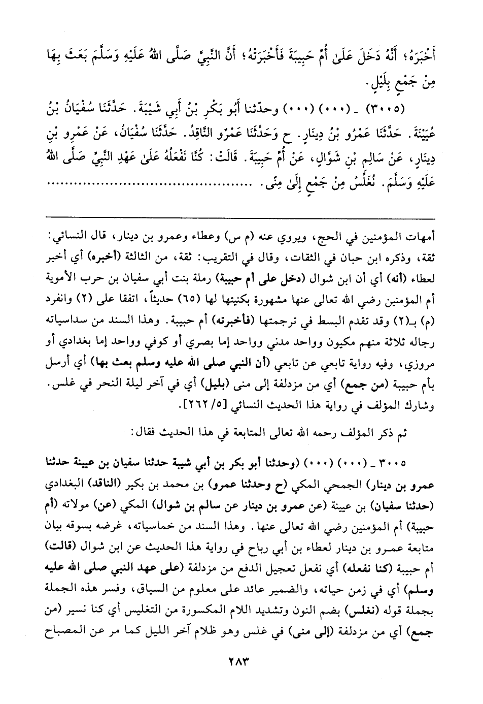 ٣٠٠٥ - (. . .) (. . .) (وحدثنا أبو بكر بن أبي شيبة حدثنا سفيان بن عيينة حدثنا عمرو بن دينار) الجمحي المكي (ح وحدثنا عمرو) بن محمَّد بن بكير (الناقد) البغدادي (حدثنا سفيان) بن عيينة (عن عمرو بن دينار عن سالم بن شوال) المكي (عن) مولاته (أم حبيبة) أم المؤمنين رضي الله تعالى عنها. وهذا السند من خماسياته، غرضه بسوقه بيان متابعة عمرو بن دينار لعطاء بن أبي رباح في رواية هذا الحديث عن ابن شوال (قالت) أم حبيبة (كنا نفعله) أي نفعل تعجيل الدفع من مزدلفة (على عهد النبي - صلى الله عليه وسلم -) أي في زمن حياته، والضمير عائد على معلوم من السياق، وفسر هذه الجملة بجملة قوله (نغلس) بضم النون وتشديد اللام المكسورة من التغليس أي كنا نسير (من جمع) أي من مزدلفة (إلى منى) في غلس وهو ظلام آخر الليل كما مر عن المصباح