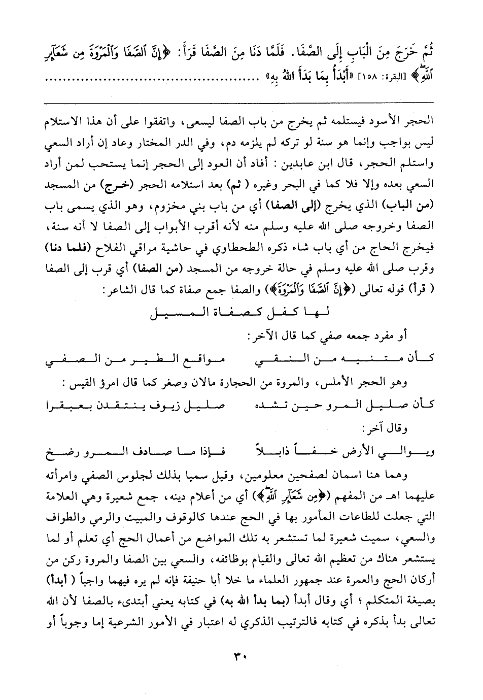 الحجر الأسود فيستلمه ثم يخرج من باب الصفا ليسعى، واتفقوا على أن هذا الاستلام ليس بواجب وإنما هو سنة لو تركه لم يلزمه دم، وفي الدر المختار وعاد إن أراد السعي واستلم الحجر، قال ابن عابدين: أفاد أن العود إلى الحجر إنما يستحب لمن أراد السعي بعده وإلا فلا كما في البحر وغيره (ثم) بعد استلامه الحجر (خرج) من المسجد (من الباب) الَّذي يخرج (إلى الصفا) أي من باب بني مخزوم، وهو الَّذي يسمى باب الصفا وخروجه صلى الله عليه وسلم منه لأنه أقرب الأبواب إلى الصفا لا أنَّه سنة، فيخرج الحاج من أي باب شاء ذكره الطحطاوي في حاشية مراقي الفلاح (فلما دنا) وقرب صلى الله عليه وسلم في حالة خروجه من المسجد (من الصفا) أي قرب إلى الصفا (قرأ) قوله تعالى ({إِنَّ الصَّفَا وَالْمَرْوَةَ) والصفا جمع صفاة كما قال الشاعر: