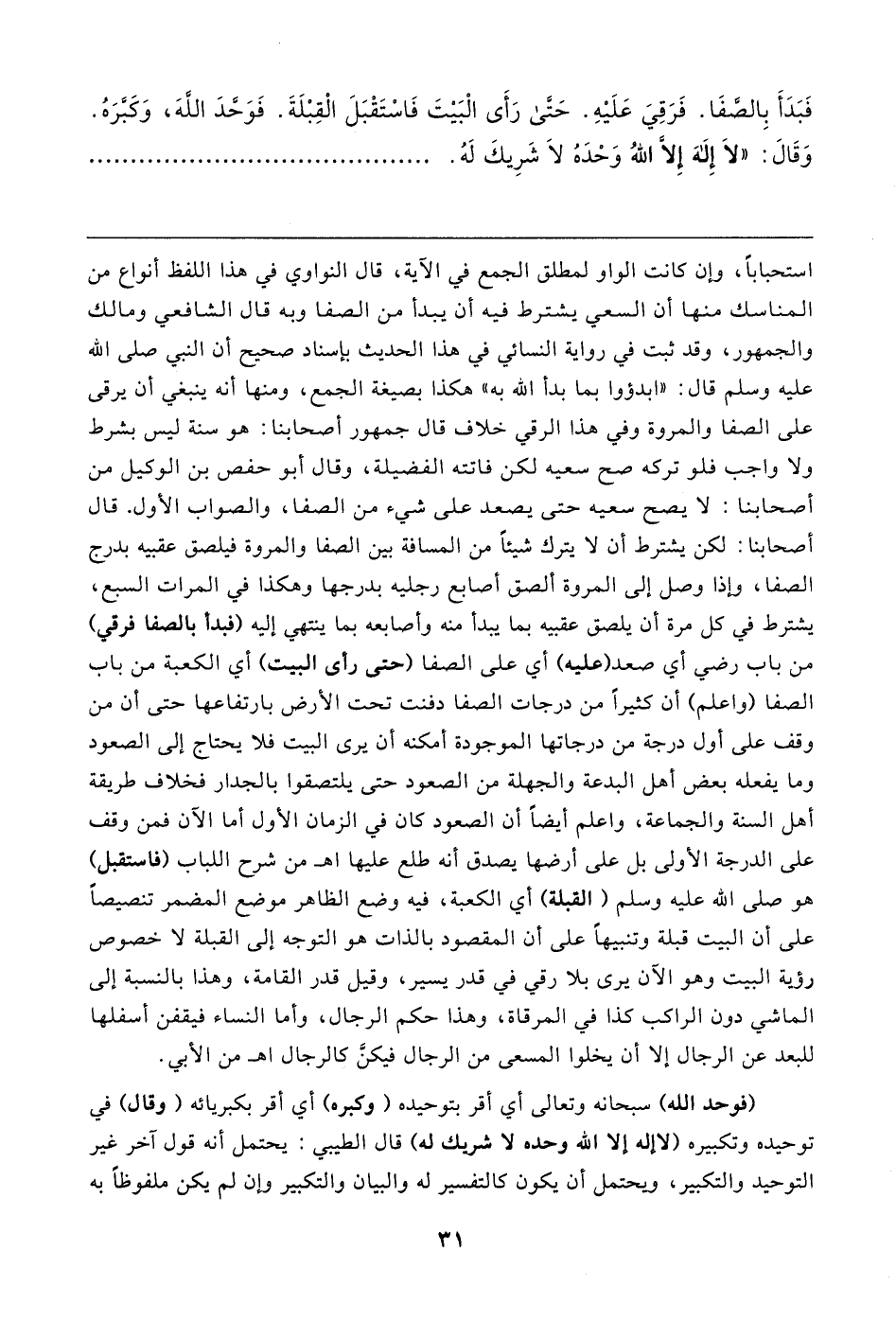 فَبَدَأَ بِالصَّفَا. فَرَقِيَ عَلَيهِ. حَتَّى رَأَى الْبَيتَ فَاسْتَقْبَلَ الْقِبْلَةَ. فَوَحَّدَ اللهَ، وَكَبَّرَهُ. وَقَال: "لَا إِلَهَ إلا اللهُ وَحْدَهُ لَا شَرِيكَ لَهُ