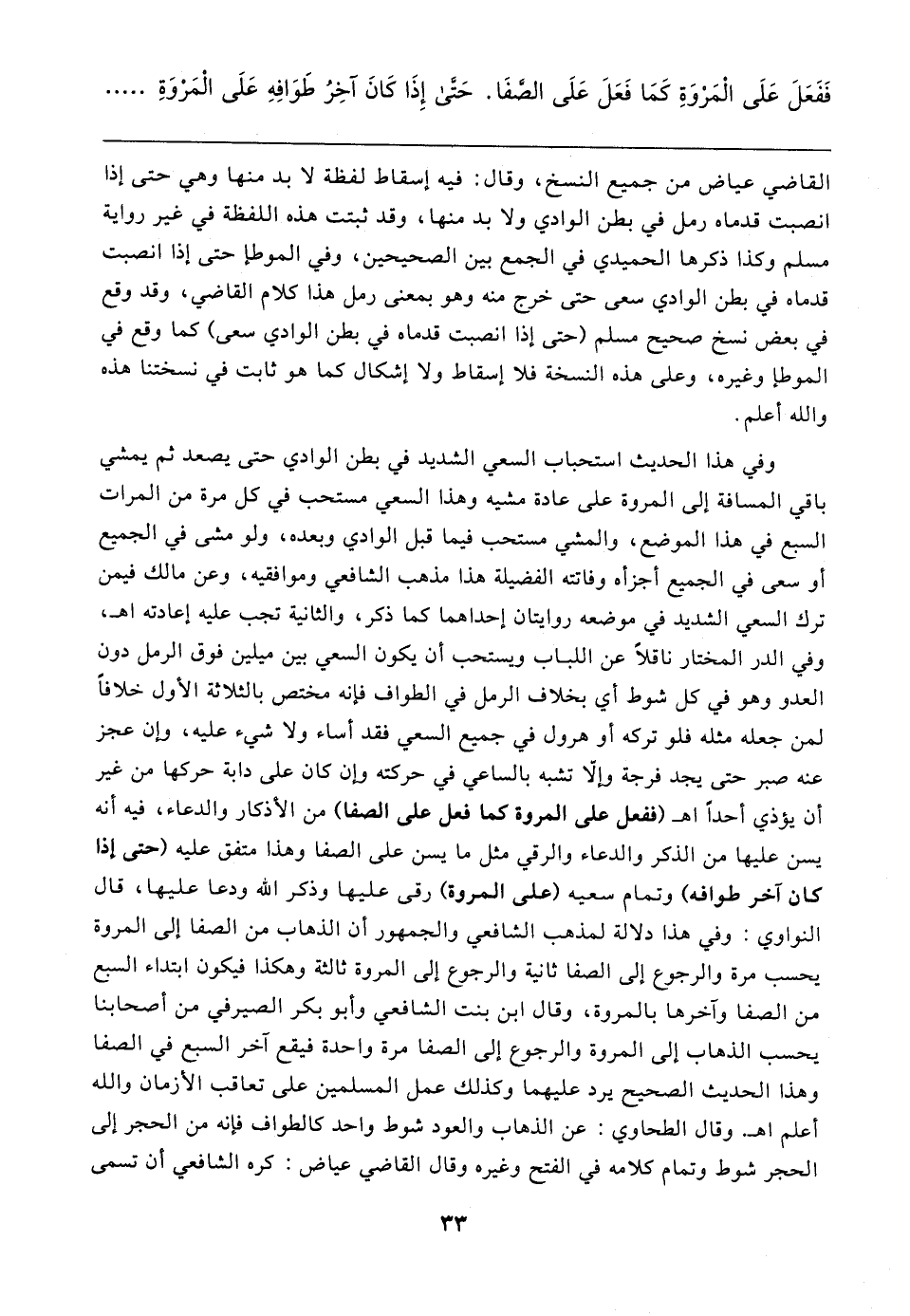 القاضي عياض من جميع النسخ، وقال: فيه إسقاط لفظة لا بد منها وهي حتَّى إذا انصبت قدماه رمل في بطن الوادي ولا بد منها، وقد ثبتت هذه اللفظة في غير رواية مسلم وكذا ذكرها الحميدي في الجمع بين الصحيحين، وفي الموطإ حتَّى إذا انصبت قدماه في بطن الوادي سعى حتَّى خرج منه وهو بمعنى رمل هذا كلام القاضي، وقد وقع في بعض نسخ صحيح مسلم (حتَّى إذا انصبت قدماه في بطن الوادي سعى) كما وقع في الموطأ وغيره، وعلى هذه النسخة فلا إسقاط ولا إشكال كما هو ثابت في نسختنا هذه والله أعلم.